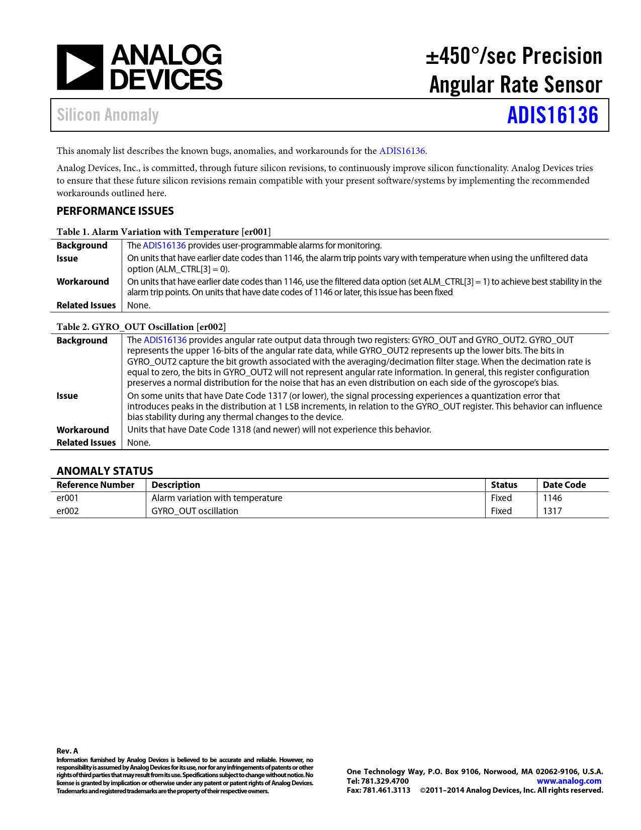 This anomaly list describes the known bugs, anomalies, and workarounds for the ADIS16136. Analog Devices, Inc., is committed, through future silicon revisions, to continuously improve silicon functionality. Analog Devices tries to ensure that these future silicon revisions remain compatible with your present software/systems by implementing the recommended workarounds outlined here.