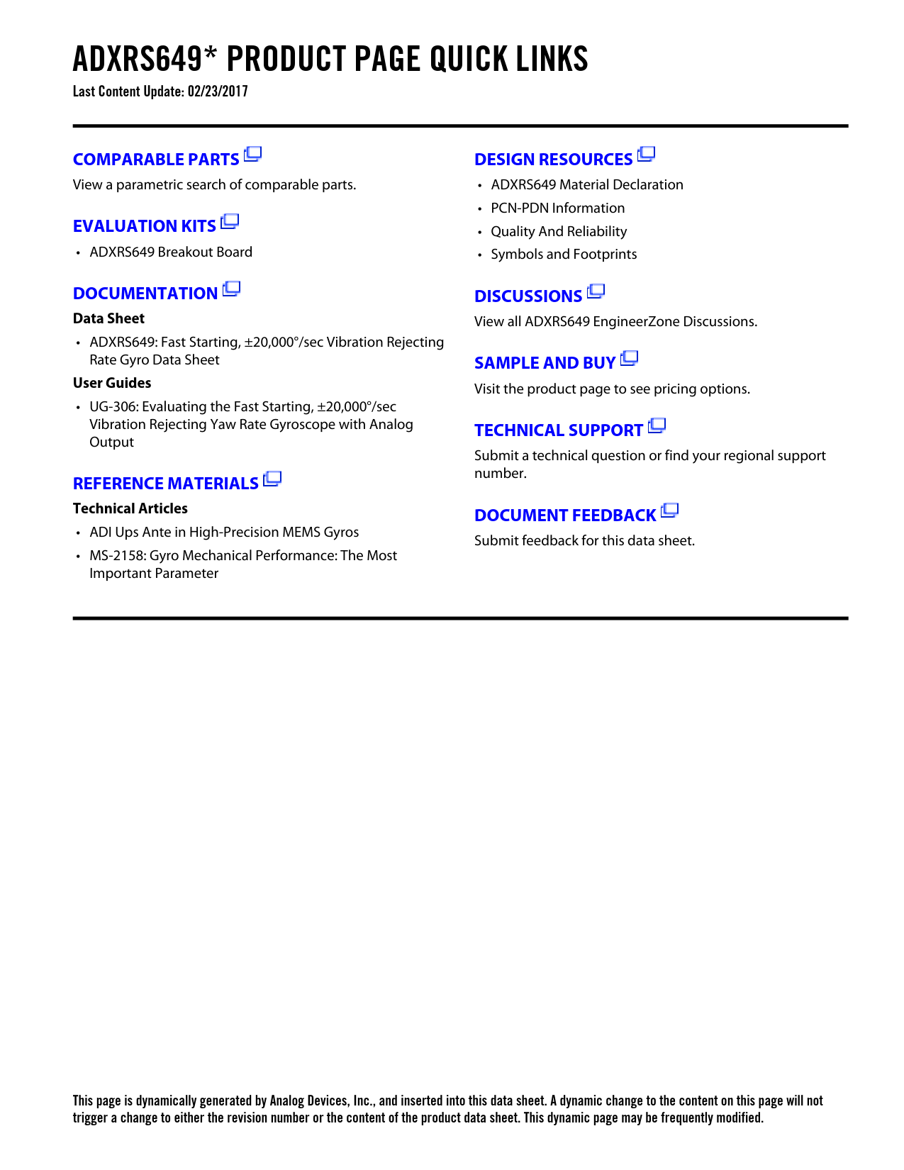 ADXRS649* PRODUCT PAGE QUICK LINKS Last Content Update: 02/23/2017COMPARABLE PARTSDESIGN RESOURCES View a parametric search of comparable parts. • ADXRS649 Material Declaration • PCN-PDN Information EVALUATION KITS • Quality And Reliability • ADXRS649 Breakout Board • Symbols and Footprints DOCUMENTATIONDISCUSSIONSData Sheet View all ADXRS649 EngineerZone Discussions. • ADXRS649: Fast Starting, ±20,000°/sec Vibration Rejecting Rate Gyro Data Sheet SAMPLE AND BUYUser Guides Visit the product page to see pricing options. • UG-306: Evaluating the Fast Starting, ±20,000°/sec Vibration Rejecting Yaw Rate Gyroscope with Analog TECHNICAL SUPPORT Output Submit a technical question or find your regional support number. REFERENCE MATERIALSTechnical ArticlesDOCUMENT FEEDBACK • ADI Ups Ante in High-Precision MEMS Gyros Submit feedback for this data sheet. • MS-2158: Gyro Mechanical Performance: The Most Important Parameter This page is dynamically generated by Analog Devices, Inc., and inserted into this data sheet. A dynamic change to the content on this page will not trigger a change to either the revision number or the content of the product data sheet. This dynamic page may be frequently modified. Document Outline Features Applications General Description Functional Block Diagram Revision History Specifications Absolute Maximum Ratings Rate Sensitive Axis ESD Caution Pin Configuration and Function Descriptions Typical Performance Characteristics Theory of Operation Setting the Bandwidth Temperature Output and Calibration Modifying the Measurement Range Null Bias Adjustment Self-Test Function Continuous Self-Test Outline Dimensions Ordering Guide