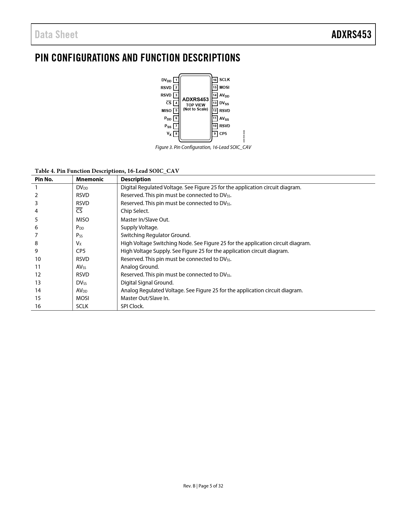 link to page 13 link to page 13 link to page 13 link to page 13 Data SheetADXRS453PIN CONFIGURATIONS AND FUNCTION DESCRIPTIONSDV116 SCLKDDRSVD 215 MOSIRSVD 314 AVDDADXRS453CS 413 DVTOP VIEWSS(Not to Scale)MISO 512 RSVDP611DDAVSSP710SSRSVD 3 V89XCP5 00 5- 15 09 Figure 3. Pin Configuration, 16-Lead SOIC_CAV Table 4. Pin Function Descriptions, 16-Lead SOIC_CAV Pin No.MnemonicDescription 1 DVDD Digital Regulated Voltage. See Figure 25 for the application circuit diagram. 2 RSVD Reserved. This pin must be connected to DVSS. 3 RSVD Reserved. This pin must be connected to DVSS. 4 CS Chip Select. 5 MISO Master In/Slave Out. 6 PDD Supply Voltage. 7 PSS Switching Regulator Ground. 8 VX High Voltage Switching Node. See Figure 25 for the application circuit diagram. 9 CP5 High Voltage Supply. See Figure 25 for the application circuit diagram. 10 RSVD Reserved. This pin must be connected to DVSS. 11 AVSS Analog Ground. 12 RSVD Reserved. This pin must be connected to DVSS. 13 DVSS Digital Signal Ground. 14 AVDD Analog Regulated Voltage. See Figure 25 for the application circuit diagram. 15 MOSI Master Out/Slave In. 16 SCLK SPI Clock. Rev. B | Page 5 of 32 Document Outline Features Applications General Description Functional Block Diagram Revision History Specifications Absolute Maximum Ratings Thermal Resistance Rate Sensitive Axis ESD Caution Pin Configurations and Function Descriptions Typical Performance Characteristics Theory of Operation Continuous Self-Test Mechanical Performance Noise Performance Applications Information Calibrated Performance Mechanical Considerations for Mounting Application Circuits ADXRS453 Signal Chain Timing SPI Communication Protocol Command/Response Device Data Latching SPI Timing Characteristics Command/Response Bit Definitions SQ2 to SQ0 Bits SM2 to SM0 Bits A8 to A0 Bits D15 to D0 Bits P Bit SPI Bit RE Bit DU Bit ST1 and ST0 Bits P0 Bit P1 Bit Fault Register Bit Definitions Fail Bit AMP Bit OV Bit UV Bit PLL Bit Q Bit NVM Bit POR Bit PWR Bit CST Bit CHK Bit Recommended Start-Up Sequence with CHK Bit Assertion Rate Data Format Memory Map and Registers Memory Map Memory Register Definitions Rate (RATEx) Registers Temperature (TEMx) Registers Low CST (LOCSTx) Registers High CST (HICSTx) Registers Quad Memory (QUADx) Registers Fault (FAULTx) Registers Part ID (PIDx) Registers Serial Number (SNx) Registers Package Orientation and Layout Information Solder Profile Package Marking Codes Outline Dimensions Ordering Guide