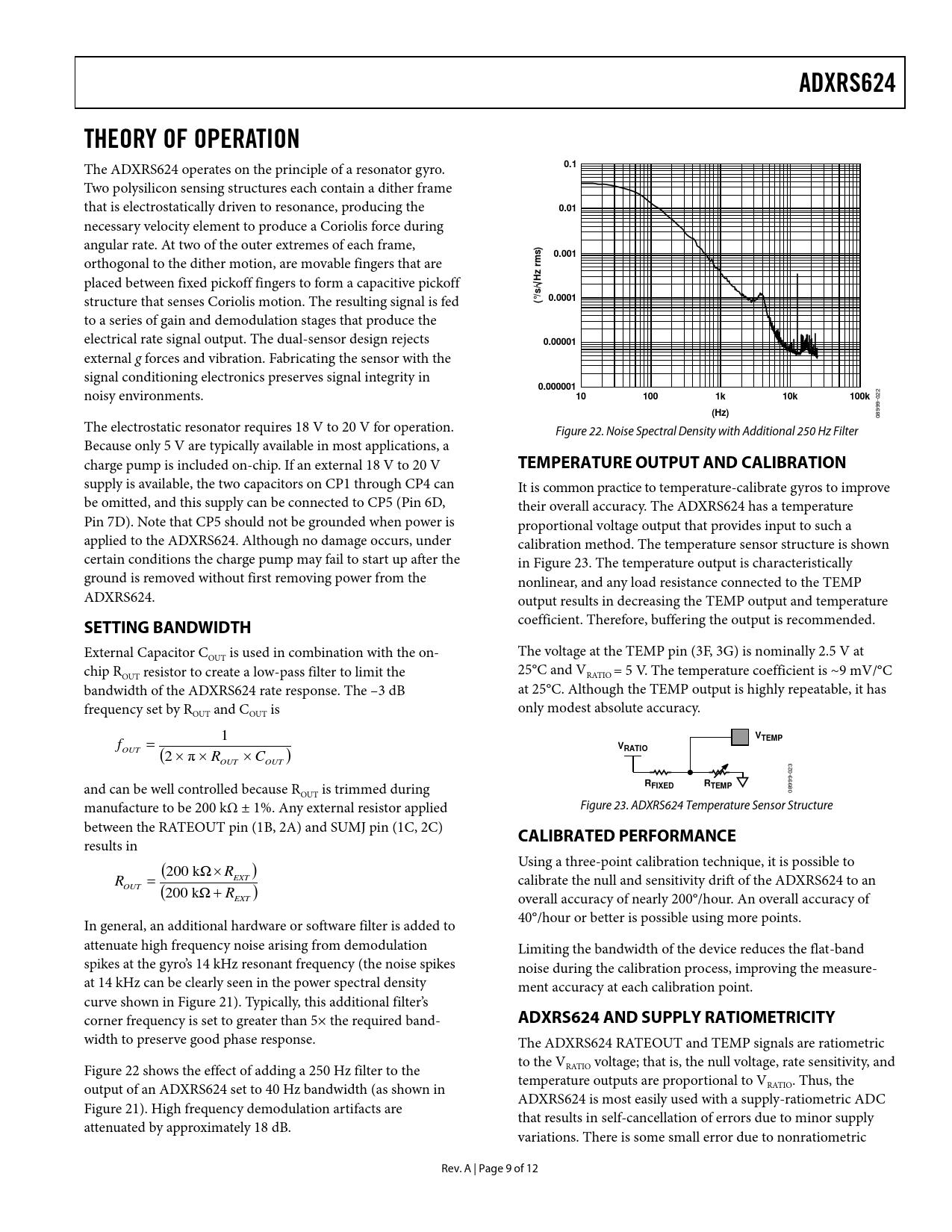 ADXRS624. THEORY OF OPERATION. 0.1. 0.01. 0.001. rms). 0.0001. (°/s/. 0.00001. 0.000001. 100. 10k. 100k. (Hz). TEMPERATURE OUTPUT AND CALIBRATION