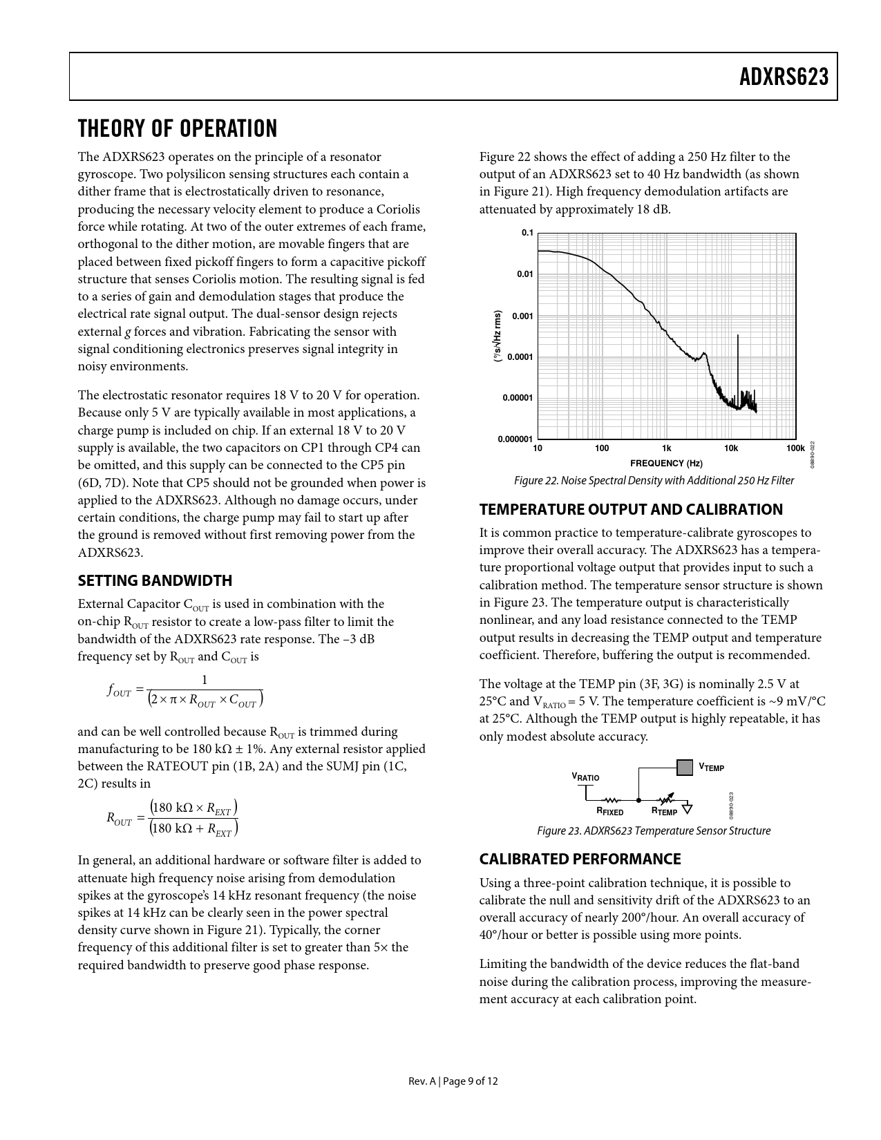link to page 9 link to page 10 link to page 9 link to page 10 ADXRS623THEORY OF OPERATION The ADXRS623 operates on the principle of a resonator Figure 22 shows the effect of adding a 250 Hz filter to the gyroscope. Two polysilicon sensing structures each contain a output of an ADXRS623 set to 40 Hz bandwidth (as shown dither frame that is electrostatical y driven to resonance, in Figure 21). High frequency demodulation artifacts are producing the necessary velocity element to produce a Coriolis attenuated by approximately 18 dB. force while rotating. At two of the outer extremes of each frame, 0.1 orthogonal to the dither motion, are movable fingers that are placed between fixed pickoff fingers to form a capacitive pickoff structure that senses Coriolis motion. The resulting signal is fed 0.01 to a series of gain and demodulation stages that produce the electrical rate signal output. The dual-sensor design rejects 0.001 external g forces and vibration. Fabricating the sensor with rms) Hz signal conditioning electronics preserves signal integrity in 0.0001 noisy environments. (°/s/ The electrostatic resonator requires 18 V to 20 V for operation. 0.00001 Because only 5 V are typically available in most applications, a charge pump is included on chip. If an external 18 V to 20 V supply is available, the two capacitors on CP1 through CP4 can 0.000001101001k10k100k 022 be omitted, and this supply can be connected to the CP5 pin FREQUENCY (Hz) 08890- (6D, 7D). Note that CP5 should not be grounded when power is Figure 22. Noise Spectral Density with Additional 250 Hz Filter applied to the ADXRS623. Although no damage occurs, under certain conditions, the charge pump may fail to start up after TEMPERATURE OUTPUT AND CALIBRATION the ground is removed without first removing power from the It is common practice to temperature-calibrate gyroscopes to ADXRS623. improve their overal accuracy. The ADXRS623 has a tempera- ture proportional voltage output that provides input to such a SETTING BANDWIDTH calibration method. The temperature sensor structure is shown External Capacitor C in Figure 23. The temperature output is characteristically OUT is used in combination with the on-chip R nonlinear, and any load resistance connected to the TEMP OUT resistor to create a low-pass filter to limit the bandwidth of the ADXRS623 rate response. The –3 dB output results in decreasing the TEMP output and temperature frequency set by R coefficient. Therefore, buffering the output is recommended. OUT and COUT is f = 1 The voltage at the TEMP pin (3F, 3G) is nominally 2.5 V at OUT ( 2 × π × R × C ) OUT OUT 25°C and VRATIO = 5 V. The temperature coefficient is ~9 mV/°C at 25°C. Although the TEMP output is highly repeatable, it has and can be well controlled because ROUT is trimmed during only modest absolute accuracy. manufacturing to be 180 kΩ ± 1%. Any external resistor applied between the RATEOUT pin (1B, 2A) and the SUMJ pin (1C, VTEMP 2C) results in VRATIO (180 kΩ × R ) 023 R = ( EXT RRFIXEDTEMP OUT 08890- 180 kΩ + R ) EXT Figure 23. ADXRS623 Temperature Sensor Structure In general, an additional hardware or software filter is added to CALIBRATED PERFORMANCE attenuate high frequency noise arising from demodulation Using a three-point calibration technique, it is possible to spikes at the gyroscope’s 14 kHz resonant frequency (the noise calibrate the nul and sensitivity drift of the ADXRS623 to an spikes at 14 kHz can be clearly seen in the power spectral overal accuracy of nearly 200°/hour. An overal accuracy of density curve shown in Figure 21). Typically, the corner 40°/hour or better is possible using more points. frequency of this additional filter is set to greater than 5× the required bandwidth to preserve good phase response. Limiting the bandwidth of the device reduces the flat-band noise during the calibration process, improving the measure- ment accuracy at each calibration point. Rev. A | Page 9 of 12 Document Outline Features Applications General Description Functional Block Diagram Revision History Specifications Absolute Maximum Ratings Rate-Sensitive Axis ESD Caution Pin Configuration and Function Descriptions Typical Performance Characteristics Theory of Operation Setting Bandwidth Temperature Output and Calibration Calibrated Performance ADXRS623 and Supply Ratiometricity Null Adjustment Self-Test Function Continuous Self-Test Outline Dimensions Ordering Guide Automotive Products
