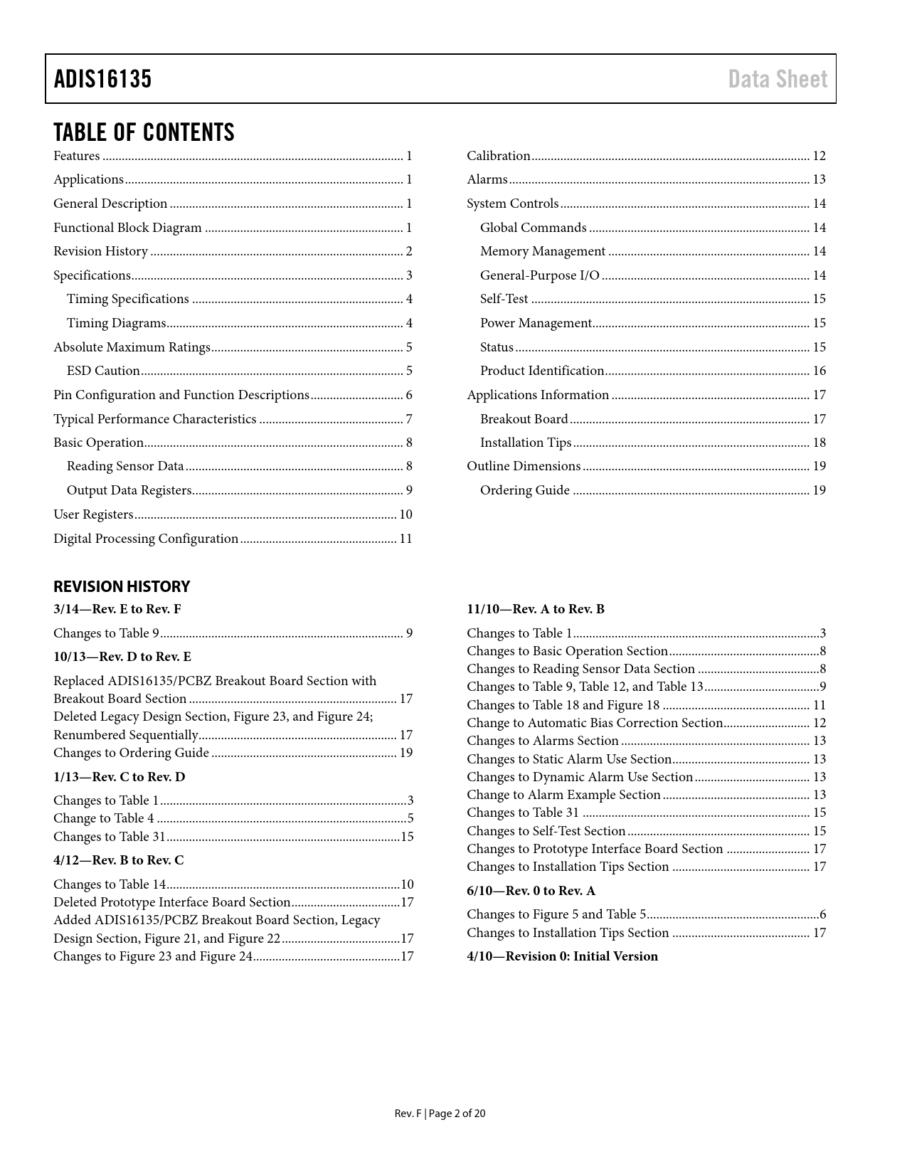 ADIS16135 Data Sheet TABLE OF CONTENTS REVISION HISTORY 3/14—Rev E to Rev F 11/10—Rev A to Rev B 10/13—Rev D to Rev E