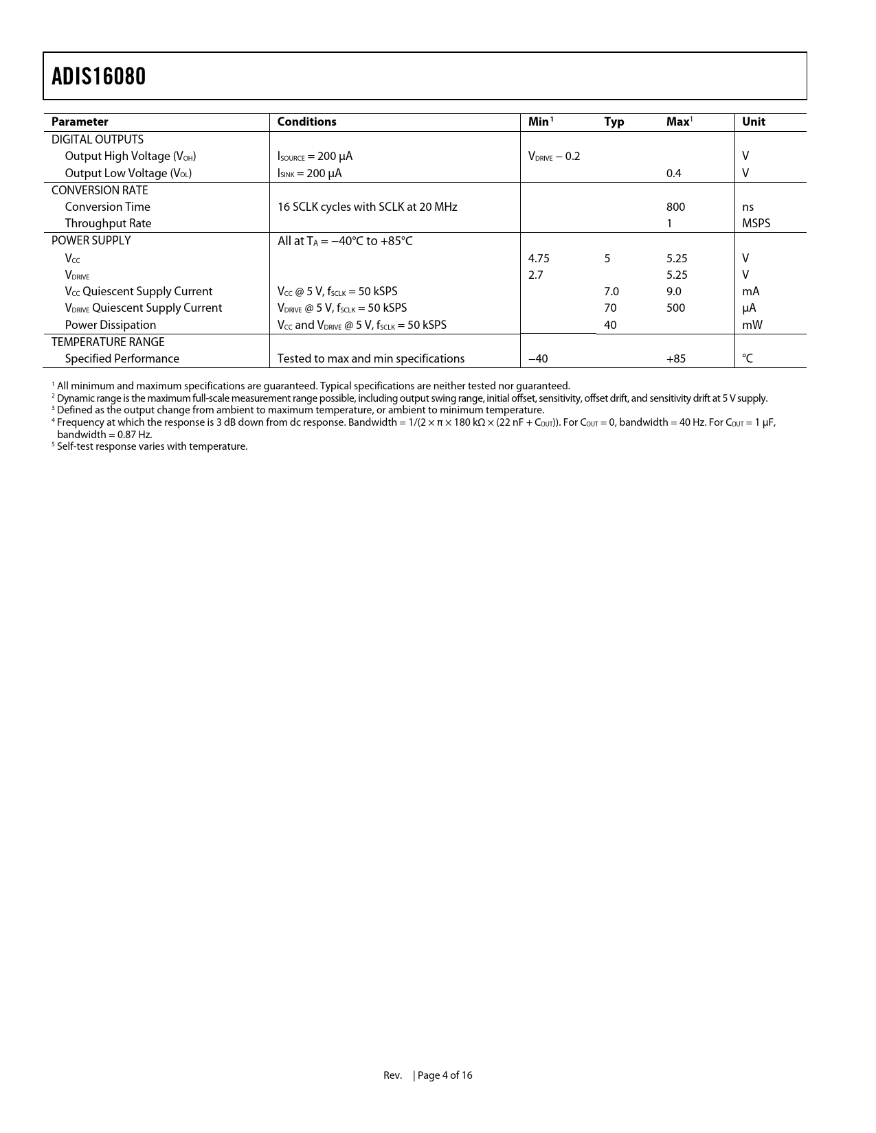 link to page 5 link to page 5 ADIS16080Parameter ConditionsMin1TypMax 1 Unit DIGITAL OUTPUTS Output High Voltage (VOH) ISOURCE = 200 μA VDRIVE − 0.2 V Output Low Voltage (VOL) ISINK = 200 μA 0.4 V CONVERSION RATE Conversion Time 16 SCLK cycles with SCLK at 20 MHz 800 ns Throughput Rate 1 MSPS POWER SUPPLY All at TA = −40°C to +85°C VCC 4.75 5 5.25 V VDRIVE 2.7 5.25 V VCC Quiescent Supply Current VCC @ 5 V, fSCLK = 50 kSPS 7.0 9.0 mA VDRIVE Quiescent Supply Current VDRIVE @ 5 V, fSCLK = 50 kSPS 70 500 μA Power Dissipation VCC and VDRIVE @ 5 V, fSCLK = 50 kSPS 40 mW TEMPERATURE RANGE Specified Performance Tested to max and min specifications −40 +85 °C 1 All minimum and maximum specifications are guaranteed. Typical specifications are neither tested nor guaranteed. 2 Dynamic range is the maximum full-scale measurement range possible, including output swing range, initial offset, sensitivity, offset drift, and sensitivity drift at 5 V supply. 3 Defined as the output change from ambient to maximum temperature, or ambient to minimum temperature. 4 Frequency at which the response is 3 dB down from dc response. Bandwidth = 1/(2 × π × 180 kΩ × (22 nF + COUT)). For COUT = 0, bandwidth = 40 Hz. For COUT = 1 μF, bandwidth = 0.87 Hz. 5 Self-test response varies with temperature. Rev. $ | Page 4 of 16 Document Outline FEATURES APPLICATIONS GENERAL DESCRIPTION FUNCTIONAL BLOCK DIAGRAM TABLE OF CONTENTS REVISION HISTORY SPECIFICATIONS TIMING SPECIFICATIONS ABSOLUTE MAXIMUM RATINGS ESD CAUTION PIN CONFIGURATION AND FUNCTION DESCRIPTIONS TYPICAL PERFORMANCE CHARACTERISTICS THEORY OF OPERATION SUPPLY AND COMMON CONSIDERATIONS INCREASING MEASUREMENT RANGE SETTING BANDWIDTH SELF-TEST FUNCTION CONTINUOUS SELF-TEST RATE SENSITIVE AXIS BASIC OPERATION SERIAL PERIPHERAL INTERFACE (SPI) Control Register ADC Conversion Output Data Access Output Coding Examples APPLICATIONS INFORMATION ASSEMBLY INTERFACE BOARD OUTLINE DIMENSIONS ORDERING GUIDE