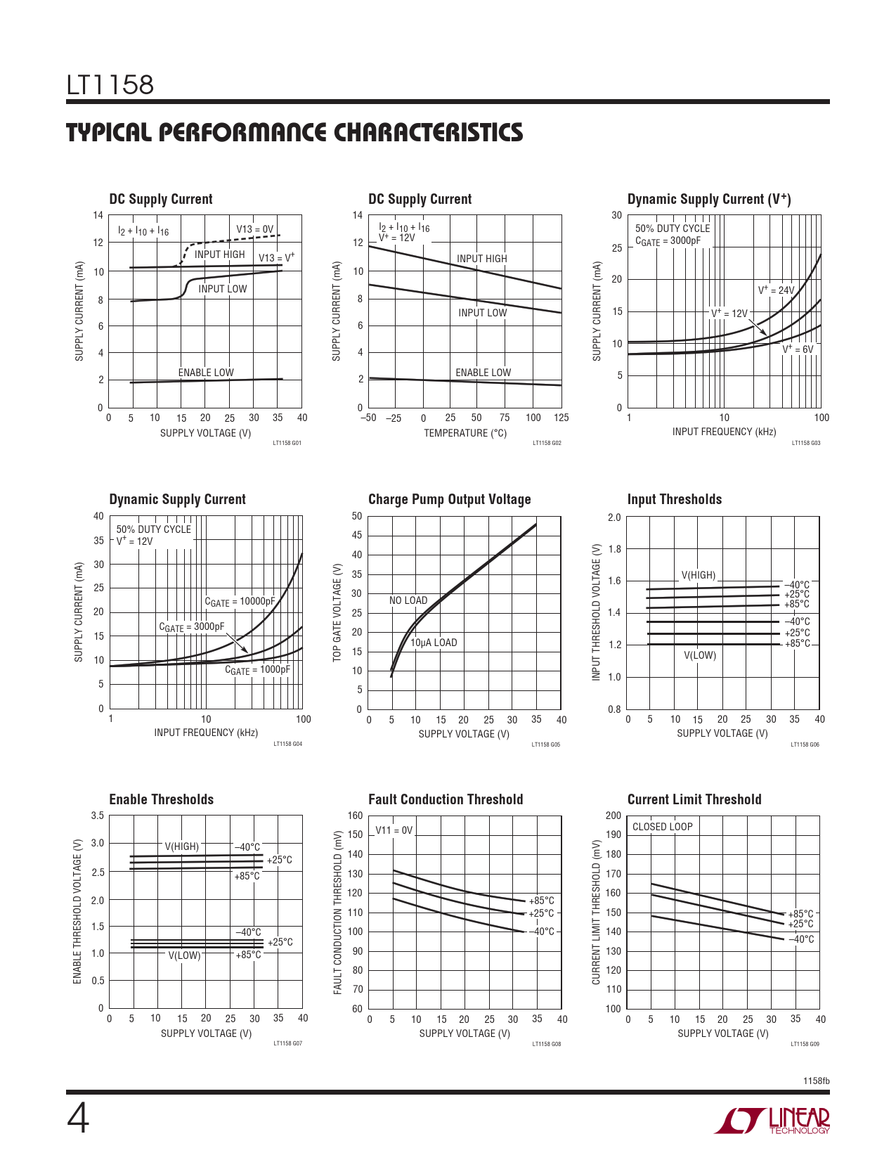 40 50 2.0 50% DUTY CYCLE 45 35 V+ = 12V 1.8 40 30 35 V(HIGH) 1.6 25 –40°C 30 +25°C CGATE = 10000pF NO LOAD +85°C 20 25 1.4 C –40°C GATE = 3000pF 15 20 +25°C 10μA LOAD 1.2 +85°C 15 SUPPLY CURRENT (mA) 10 TOP GATE VOLTAGE (V) V(LOW) CGATE = 1000pF 10 INPUT THRESHOLD VOLTAGE (V) 1.0 5 5 0 0 0.8 1 10 100 0 5 10 15 20 25 30 35 40 0 5 10 15 20 25 30 35 40 INPUT FREQUENCY (kHz) SUPPLY VOLTAGE (V) SUPPLY VOLTAGE (V) LT1158 G04 LT1158 G05 LT1158 G06