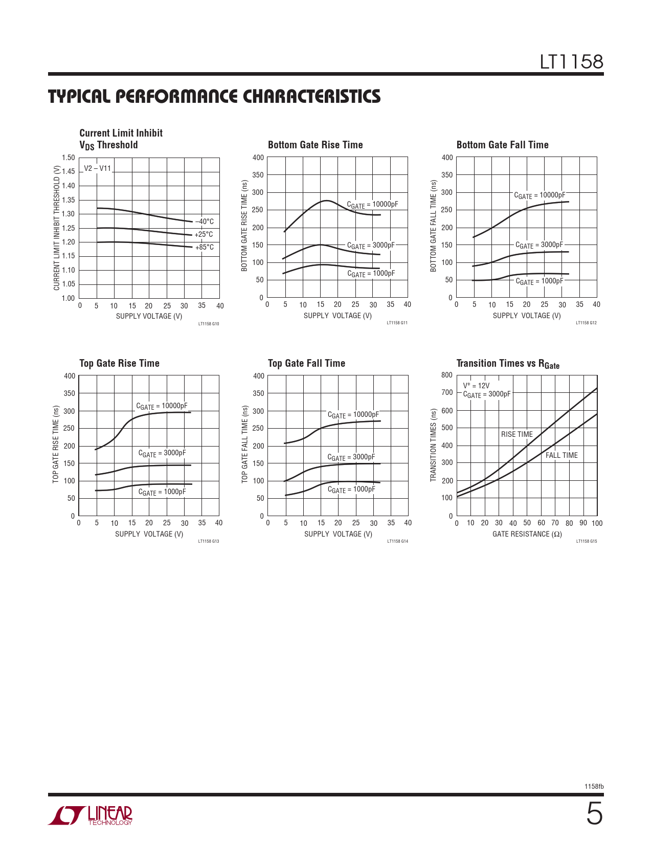 400 400 800 V+ = 12V 350 350 700 CGATE = 3000pF C 300 GATE = 10000pF 300 600 CGATE = 10000pF 250 250 500 RISE TIME 200 200 400 CGATE = 3000pF CGATE = 3000pF FALL TIME 150 150 300 TOP GATE RISE TIME (ns) 100 TOP GATE FALL TIME (ns) 100 TRANSITION TIMES (ns) 200 C C GATE = 1000pF GATE = 1000pF 50 50 100 0 0 0 0 5 10 15 20 25 30 35 40 0 5 10 15 20 25 30 35 40 0 10 20 30 40 50 60 70 80 90 100 SUPPLY VOLTAGE (V) SUPPLY VOLTAGE (V) GATE RESISTANCE (Ω) LT1158 G13 LT1158 G14 LT1158 G15 1158fb 5
