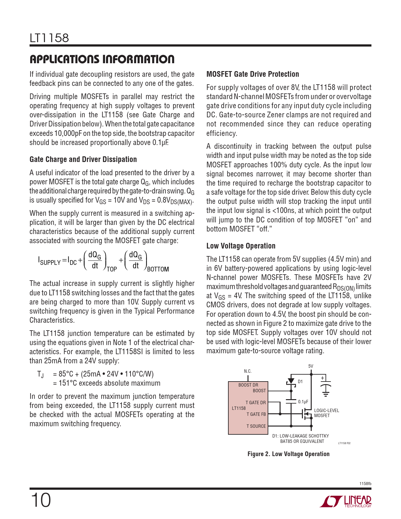 LT1158 APPLICATIONS INFORMATION If individual gate decoupling resistors are used, the gate MOSFET Gate Drive Protection feedback pins can be connected to any one of the gates. For supply voltages of over 8V, the LT1158 will protect Driving multiple MOSFETs in parallel may restrict the standard N-channel MOSFETs from under or overvoltage operating frequency at high supply voltages to prevent gate drive conditions for any input duty cycle including over-dissipation in the LT1158 (see Gate Charge and DC. Gate-to-source Zener clamps are not required and Driver Dissipation below). When the total gate capacitance not recommended since they can reduce operating exceeds 10,000pF on the top side, the bootstrap capacitor efficiency. should be increased proportionally above 0.1μF. A discontinuity in tracking between the output pulse width and input pulse width may be noted as the top side Gate Charge and Driver Dissipation MOSFET approaches 100% duty cycle. As the input low A useful indicator of the load presented to the driver by a signal becomes narrower, it may become shorter than power MOSFET is the total gate charge QG, which includes the time required to recharge the bootstrap capacitor to the additional charge required by the gate-to-drain swing. QG a safe voltage for the top side driver. Below this duty cycle is usually specifi ed for VGS = 10V and VDS = 0.8VDS(MAX). the output pulse width will stop tracking the input until When the supply current is measured in a switching ap- the input low signal is <100ns, at which point the output plication, it will be larger than given by the DC electrical will jump to the DC condition of top MOSFET “on” and characteristics because of the additional supply current bottom MOSFET “off.” associated with sourcing the MOSFET gate charge: Low Voltage Operation dQ ⎞ dQ ⎞ I =I G G The LT1158 can operate from 5V supplies (4.5V min) and SUPPLY DC + ⎛ ⎝⎜ dt ⎠⎟ + ⎛⎝⎜ dt ⎠⎟ TOP BOTTOM in 6V battery-powered applications by using logic-level N-channel power MOSFETs. These MOSFETs have 2V The actual increase in supply current is slightly higher maximum threshold voltages and guaranteed RDS(ON) limits due to LT1158 switching losses and the fact that the gates at VGS = 4V. The switching speed of the LT1158, unlike are being charged to more than 10V. Supply current vs CMOS drivers, does not degrade at low supply voltages. switching frequency is given in the Typical Performance For operation down to 4.5V, the boost pin should be con- Characteristics. nected as shown in Figure 2 to maximize gate drive to the The LT1158 junction temperature can be estimated by top side MOSFET. Supply voltages over 10V should not using the equations given in Note 1 of the electrical char- be used with logic-level MOSFETs because of their lower acteristics. For example, the LT1158SI is limited to less maximum gate-to-source voltage rating. than 25mA from a 24V supply: 5V T N.C. J = 85°C + (25mA • 24V • 110°C/W) + = 151°C exceeds absolute maximum D1 BOOST DR BOOST In order to prevent the maximum junction temperature 0.1μF from being exceeded, the LT1158 supply current must T GATE DR LT1158 LOGIC-LEVEL be checked with the actual MOSFETs operating at the T GATE FB MOSFET maximum switching frequency. T SOURCE D1: LOW-LEAKAGE SCHOTTKY BAT85 OR EQUIVALENT LT1158 F02 Figure 2. Low Voltage Operation 1158fb 10