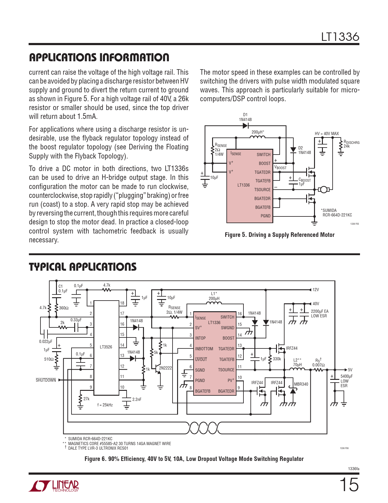 LT1336 applicaTions inForMaTion current can raise the voltage of the high voltage rail. This The motor speed in these examples can be controlled by can be avoided by placing a discharge resistor between HV switching the drivers with pulse width modulated square supply and ground to divert the return current to ground waves. This approach is particularly suitable for micro- as shown in Figure 5. For a high voltage rail of 40V, a 26k computers/DSP control loops. resistor or smaller should be used, since the top driver D1 will return about 1.5mA. 1N4148 For applications where using a discharge resistor is un- 200µH* HV = 40V MAX desirable, use the flyback regulator topology instead of + R R DISCHRG SENSE the boost regulator topology (see Deriving the Floating D2 24k 2Ω I 1/4W SENSE SWITCH 1N4148 Supply with the Flyback Topology). + V+ BOOST VBOOST To drive a DC motor in both directions, two LT1336s V+ + TGATEDR 10µF can be used to drive an H-bridge output stage. In this + TGATEFB CBOOST LT1336 1µF configuration the motor can be made to run clockwise, – TSOURCE counterclockwise, stop rapidly (“plugging” braking) or free BGATEDR run (coast) to a stop. A very rapid stop may be achieved BGATEFB *SUMIDA by reversing the current, though this requires more careful PGND RCR-664D-221KC design to stop the motor dead. In practice a closed-loop 1336 F05 control system with tachometric feedback is usual y Figure 5. Driving a Supply Referenced Motor necessary. Typical applicaTions C1 0.1µF 4.7k 0.1µF + + 12V L1* 1µF 10µF 200µH 1 18 40V 4.7k 360Ω RSENSE + + 2Ω, 1/4W 2200µF EA 2 17 1 16 1N4148 LOW ESR ISENSE SWITCH 0.33µF 2k 1N4148 LT1336 1N4148 3 16 2 15 SV+ SWGND 4 15 3 14 INTOP BOOST 0.022µF + 5 14 1k 4 13 LT3526 1µF INBOTTOM TGATEDR IRFZ44 0.1µF 1N4148 5k 6 13 + 5 12 510Ω UVOUT TGATEFB 1µF 330k L2** R † S 70µH 0.007Ω 7 12 1k 6 11 2N2222 SGND TSOURCE 5V 8 11 7 10 + 5400µF SHUTDOWN PGND PV+ LOW IRFZ44 IRFZ44 MBR340 ESR 9 10 8 9 BGATEFB BGATEDR 27k 2.2nF f = 25kHz * SUMIDA RCR-664D-221KC ** MAGNETICS CORE #55585-A2 30 TURNS 14GA MAGNET WIRE † 1336 F06 DALE TYPE LVR-3 ULTRONIX RCS01 Figure 6. 90% Efficiency, 40V to 5V, 10A, Low Dropout Voltage Mode Switching Regulator 1336fa 15 Document Outline Features Applications Description Typical Application Absolute Maximum Ratings Pin Configuration Order Information Electrical Characteristics Typical Performance Characteristics Pin Functions Functional Diagram Test Circuit Timing Diagram Operation Applications Information Typical Applications Package Description Revision History Typical Application Related Parts