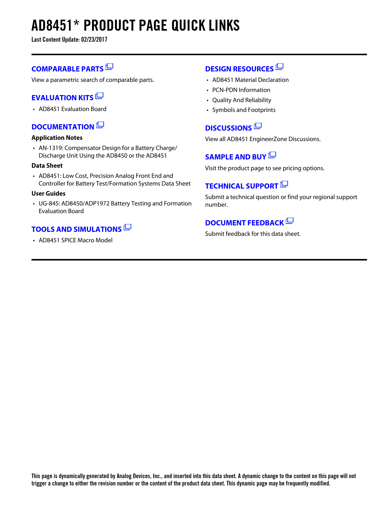 AD8451* PRODUCT PAGE QUICK LINKS Last Content Update: 02/23/2017COMPARABLE PARTSDESIGN RESOURCES View a parametric search of comparable parts. • AD8451 Material Declaration • PCN-PDN Information EVALUATION KITS • Quality And Reliability • AD8451 Evaluation Board • Symbols and Footprints DOCUMENTATIONDISCUSSIONSApplication Notes View all AD8451 EngineerZone Discussions. • AN-1319: Compensator Design for a Battery Charge/ Discharge Unit Using the AD8450 or the AD8451 SAMPLE AND BUYData Sheet Visit the product page to see pricing options. • AD8451: Low Cost, Precision Analog Front End and Controller for Battery Test/Formation Systems Data Sheet TECHNICAL SUPPORTUser Guides Submit a technical question or find your regional support • UG-845: AD8450/ADP1972 Battery Testing and Formation number. Evaluation Board DOCUMENT FEEDBACKTOOLS AND SIMULATIONS Submit feedback for this data sheet. • AD8451 SPICE Macro Model This page is dynamically generated by Analog Devices, Inc., and inserted into this data sheet. A dynamic change to the content on this page will not trigger a change to either the revision number or the content of the product data sheet. This dynamic page may be frequently modified. Document Outline FEATURES APPLICATIONS GENERAL DESCRIPTION FUNCTIONAL BLOCK DIAGRAM TABLE OF CONTENTS REVISION HISTORY SPECIFICATIONS ABSOLUTE MAXIMUM RATINGS THERMAL RESISTANCE ESD CAUTION PIN CONFIGURATION AND FUNCTION DESCRIPTIONS TYPICAL PERFORMANCE CHARACTERISTICS IA CHARACTERISTICS DA CHARACTERISTICS CC AND CV LOOP FILTER AMPLIFIERS, AND VSET BUFFER VINT BUFFER REFERENCE CHARACTERISTICS THEORY OF OPERATION OVERVIEW INSTRUMENTATION AMPLIFIER (IA) Reversing Polarity When Charging and Discharging IA Offset Option Battery Reversal and Overvoltage Protection DIFFERENCE AMPLIFIER (DA) CC AND CV LOOP FILTER AMPLIFIERS Compensation VINT Buffer MODE PIN, CHARGE AND DISCHARGE CONTROL APPLICATIONS INFORMATION FUNCTIONAL DESCRIPTION POWER SUPPLY CONNECTIONS CURRENT SENSE IA CONNECTIONS Current Sensors Optional Low-Pass Filter VOLTAGE SENSE DA CONNECTIONS Reverse Battery Conditions BATTERY CURRENT AND VOLTAGE CONTROL INPUTS (ISET AND VSET) LOOP FILTER AMPLIFIERS CONNECTING TO A PWM CONTROLLER (VCTRL PIN) STEP-BY-STEP DESIGN EXAMPLE Step 1: Design the Switching Power Converter Step 2: Identify the Control Voltage Range of the ADP1972 Step 3: Determine the Control Voltage for the CV Loop Step 4: Determine the Control Voltage for the CC Loop and the Shunt Resistor Step 5: Choose the Control Voltage Sources Step 6: Select the Compensation Devices EVALUATION BOARD INTRODUCTION FEATURES AND TESTS EVALUATING THE AD8451 Test the Instrumentation Amplifier 20 mV Offset at IMEAS Output Test the Difference Amplifier 5 mV Offset at BVMEAS Output CC and CV Integrator Tests Loop Compensation SCHEMATIC AND ARTWORK OUTLINE DIMENSIONS ORDERING GUIDE