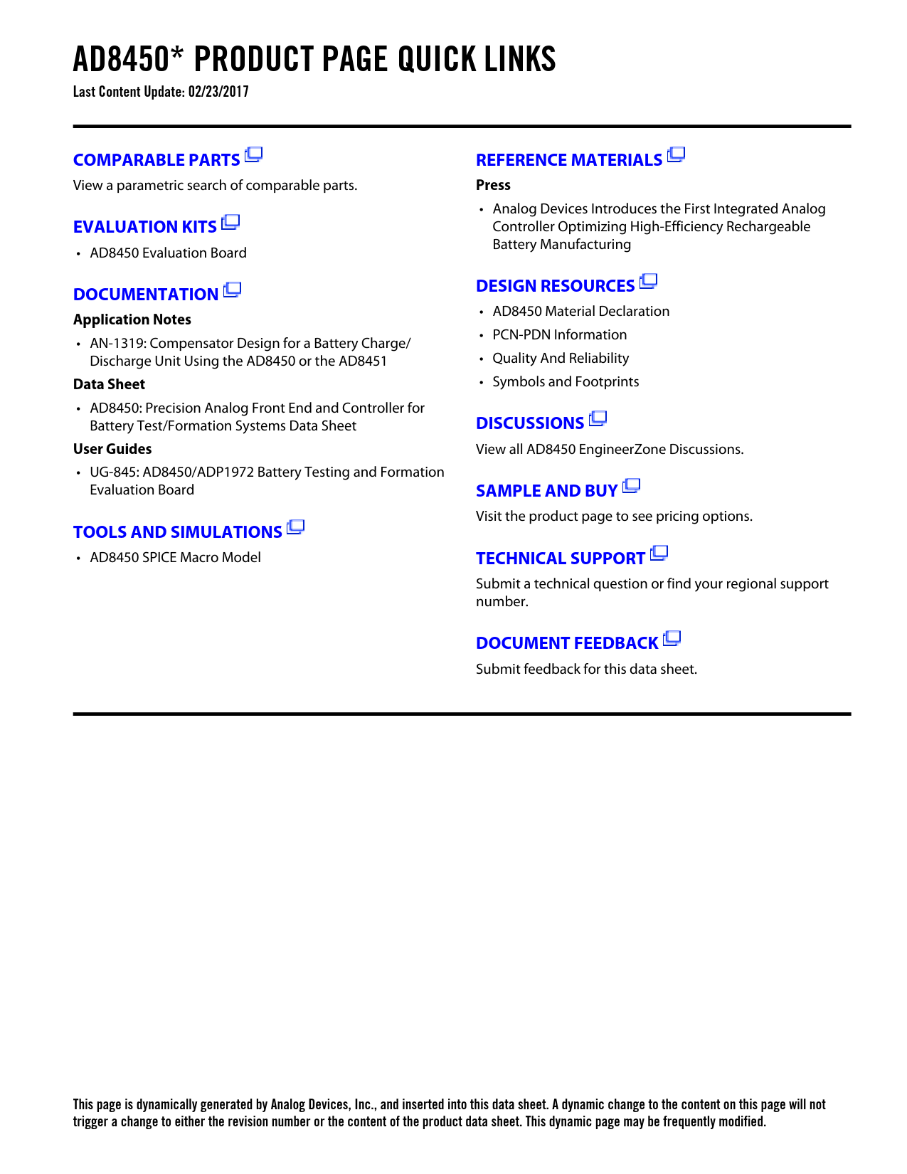 AD8450* PRODUCT PAGE QUICK LINKS Last Content Update: 02/23/2017COMPARABLE PARTSREFERENCE MATERIALS View a parametric search of comparable parts. Press • Analog Devices Introduces the First Integrated Analog EVALUATION KITS Controller Optimizing High-Efficiency Rechargeable Battery Manufacturing • AD8450 Evaluation Board DOCUMENTATIONDESIGN RESOURCES • AD8450 Material Declaration Application Notes • PCN-PDN Information • AN-1319: Compensator Design for a Battery Charge/ Discharge Unit Using the AD8450 or the AD8451 • Quality And Reliability Data Sheet • Symbols and Footprints • AD8450: Precision Analog Front End and Controller for Battery Test/Formation Systems Data Sheet DISCUSSIONSUser Guides View all AD8450 EngineerZone Discussions. • UG-845: AD8450/ADP1972 Battery Testing and Formation Evaluation Board SAMPLE AND BUY Visit the product page to see pricing options. TOOLS AND SIMULATIONS • AD8450 SPICE Macro Model TECHNICAL SUPPORT Submit a technical question or find your regional support number. DOCUMENT FEEDBACK Submit feedback for this data sheet. This page is dynamically generated by Analog Devices, Inc., and inserted into this data sheet. A dynamic change to the content on this page will not trigger a change to either the revision number or the content of the product data sheet. This dynamic page may be frequently modified. Document Outline FEATURES APPLICATIONS GENERAL DESCRIPTION FUNCTIONAL BLOCK DIAGRAM TABLE OF CONTENTS REVISION HISTORY SPECIFICATIONS ABSOLUTE MAXIMUM RATINGS THERMAL RESISTANCE ESD CAUTION PIN CONFIGURATION AND FUNCTION DESCRIPTIONS TYPICAL PERFORMANCE CHARACTERISTICS PGIA CHARACTERISTICS PGDA CHARACTERISTICS CC AND CV LOOP FILTER AMPLIFIERS, UNCOMMITTED OP AMP, AND VSET BUFFER VINT BUFFER CURRENT SHARING AMPLIFIER COMPARATORS REFERENCE CHARACTERISTICS THEORY OF OPERATION INTRODUCTION PROGRAMMABLE GAIN INSTRUMENTATION AMPLIFIER (PGIA) Gain Selection Reversing Polarity When Charging and Discharging PGIA Offset Option Battery Reversal and Overvoltage Protection PROGRAMMABLE GAIN DIFFERENCE AMPLIFIER (PGDA) CC AND CV LOOP FILTER AMPLIFIERS COMPENSATION VINT BUFFER MODE PIN, CHARGE AND DISCHARGE CONTROL OVERCURRENT AND OVERVOLTAGE COMPARATORS CURRENT SHARING BUS AND IMAX OUTPUT APPLICATIONS INFORMATION FUNCTIONAL DESCRIPTION POWER SUPPLY CONNECTIONS POWER SUPPLY SEQUENCING POWER-ON SEQUENCE POWER-OFF SEQUENCE PGIA CONNECTIONS Current Sensors Optional Low-Pass Filter PGDA CONNECTIONS Reverse Battery Conditions BATTERY CURRENT AND VOLTAGE CONTROL INPUTS (ISET AND VSET) LOOP FILTER AMPLIFIERS CONNECTING TO A PWM CONTROLLER (VCTRL PIN) OVERVOLTAGE AND OVERCURRENT COMPARATORS STEP BY STEP DESIGN EXAMPLE Step 1: Design the Switching Power Converter Step 2: Identify the Control Voltage Range of the ADP1972 Step 3: Determine the Control Voltage for the CV Loop and the PGDA Gain Step 4: Determine the Control Voltage for the CC Loop, the Shunt Resistor, and the PGIA Gain Step 5: Choose the Control Voltage Sources Step 6: Select the Compensation Devices ADDITIONAL INFORMATION EVALUATION BOARD INTRODUCTION FEATURES AND TESTS TESTING THE AD8450-EVALZ PGIA and Offset PGIA Gain Test PGIA in an Application Simple Offset Test Offset in an Application PGDA and Offset Simple Test PGDA in an Application PGDA Offset Overload Comparators VSET Buffer CV and CC Loop Filter Amplifiers CC and CV Integrator Tests Uncommitted Op Amp USING THE AD8450 SCHEMATIC AND ARTWORK OUTLINE DIMENSIONS ORDERING GUIDE