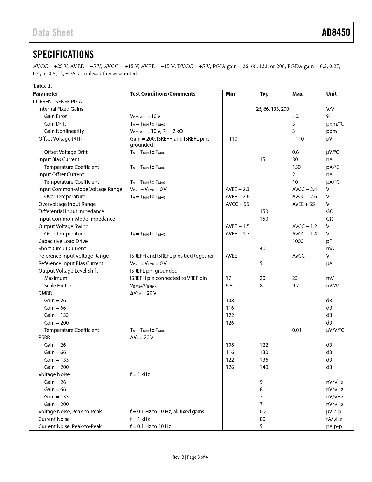 Data SheetAD8450SPECIFICATIONS AVCC = +25 V, AVEE = −5 V; AVCC = +15 V, AVEE = −15 V; DVCC = +5 V; PGIA gain = 26, 66, 133, or 200; PGDA gain = 0.2, 0.27, 0.4, or 0.8; TA = 25°C, unless otherwise noted. Table 1. ParameterTest Conditions/CommentsMinTypMaxUnit CURRENT SENSE PGIA Internal Fixed Gains 26, 66, 133, 200 V/V Gain Error VISMEA = ±10 V ±0.1 % Gain Drift TA = TMIN to TMAX 3 ppm/°C Gain Nonlinearity VISMEA = ±10 V, RL = 2 kΩ 3 ppm Offset Voltage (RTI) Gain = 200, ISREFH and ISREFL pins −110 +110 µV grounded Offset Voltage Drift TA = TMIN to TMAX 0.6 µV/°C Input Bias Current 15 30 nA Temperature Coefficient TA = TMIN to TMAX 150 pA/°C Input Offset Current 2 nA Temperature Coefficient TA = TMIN to TMAX 10 pA/°C Input Common-Mode Voltage Range VISVP − VISVN = 0 V AVEE + 2.3 AVCC − 2.4 V Over Temperature TA = TMIN to TMAX AVEE + 2.6 AVCC − 2.6 V Overvoltage Input Range AVCC − 55 AVEE + 55 V Differential Input Impedance 150 GΩ Input Common-Mode Impedance 150 GΩ Output Voltage Swing AVEE + 1.5 AVCC − 1.2 V Over Temperature TA = TMIN to TMAX AVEE + 1.7 AVCC − 1.4 V Capacitive Load Drive 1000 pF Short-Circuit Current 40 mA Reference Input Voltage Range ISREFH and ISREFL pins tied together AVEE AVCC V Reference Input Bias Current VISVP = VISVN = 0 V 5 µA Output Voltage Level Shift ISREFL pin grounded Maximum ISREFH pin connected to VREF pin 17 20 23 mV Scale Factor VISMEA/VISREFH 6.8 8 9.2 mV/V CMRR ΔVCM = 20 V Gain = 26 108 dB Gain = 66 116 dB Gain = 133 122 dB Gain = 200 126 dB Temperature Coefficient TA = TMIN to TMAX 0.01 µV/V/°C PSRR ΔVS = 20 V Gain = 26 108 122 dB Gain = 66 116 130 dB Gain = 133 122 136 dB Gain = 200 126 140 dB Voltage Noise f = 1 kHz Gain = 26 9 nV/√Hz Gain = 66 8 nV/√Hz Gain = 133 7 nV/√Hz Gain = 200 7 nV/√Hz Voltage Noise, Peak-to-Peak f = 0.1 Hz to 10 Hz, all fixed gains 0.2 µV p-p Current Noise f = 1 kHz 80 fA/√Hz Current Noise, Peak-to-Peak f = 0.1 Hz to 10 Hz 5 pA p-p Rev. B | Page 3 of 41 Document Outline FEATURES APPLICATIONS GENERAL DESCRIPTION FUNCTIONAL BLOCK DIAGRAM TABLE OF CONTENTS REVISION HISTORY SPECIFICATIONS ABSOLUTE MAXIMUM RATINGS THERMAL RESISTANCE ESD CAUTION PIN CONFIGURATION AND FUNCTION DESCRIPTIONS TYPICAL PERFORMANCE CHARACTERISTICS PGIA CHARACTERISTICS PGDA CHARACTERISTICS CC AND CV LOOP FILTER AMPLIFIERS, UNCOMMITTED OP AMP, AND VSET BUFFER VINT BUFFER CURRENT SHARING AMPLIFIER COMPARATORS REFERENCE CHARACTERISTICS THEORY OF OPERATION INTRODUCTION PROGRAMMABLE GAIN INSTRUMENTATION AMPLIFIER (PGIA) Gain Selection Reversing Polarity When Charging and Discharging PGIA Offset Option Battery Reversal and Overvoltage Protection PROGRAMMABLE GAIN DIFFERENCE AMPLIFIER (PGDA) CC AND CV LOOP FILTER AMPLIFIERS COMPENSATION VINT BUFFER MODE PIN, CHARGE AND DISCHARGE CONTROL OVERCURRENT AND OVERVOLTAGE COMPARATORS CURRENT SHARING BUS AND IMAX OUTPUT APPLICATIONS INFORMATION FUNCTIONAL DESCRIPTION POWER SUPPLY CONNECTIONS POWER SUPPLY SEQUENCING POWER-ON SEQUENCE POWER-OFF SEQUENCE PGIA CONNECTIONS Current Sensors Optional Low-Pass Filter PGDA CONNECTIONS Reverse Battery Conditions BATTERY CURRENT AND VOLTAGE CONTROL INPUTS (ISET AND VSET) LOOP FILTER AMPLIFIERS CONNECTING TO A PWM CONTROLLER (VCTRL PIN) OVERVOLTAGE AND OVERCURRENT COMPARATORS STEP BY STEP DESIGN EXAMPLE Step 1: Design the Switching Power Converter Step 2: Identify the Control Voltage Range of the ADP1972 Step 3: Determine the Control Voltage for the CV Loop and the PGDA Gain Step 4: Determine the Control Voltage for the CC Loop, the Shunt Resistor, and the PGIA Gain Step 5: Choose the Control Voltage Sources Step 6: Select the Compensation Devices ADDITIONAL INFORMATION EVALUATION BOARD INTRODUCTION FEATURES AND TESTS TESTING THE AD8450-EVALZ PGIA and Offset PGIA Gain Test PGIA in an Application Simple Offset Test Offset in an Application PGDA and Offset Simple Test PGDA in an Application PGDA Offset Overload Comparators VSET Buffer CV and CC Loop Filter Amplifiers CC and CV Integrator Tests Uncommitted Op Amp USING THE AD8450 SCHEMATIC AND ARTWORK OUTLINE DIMENSIONS ORDERING GUIDE
