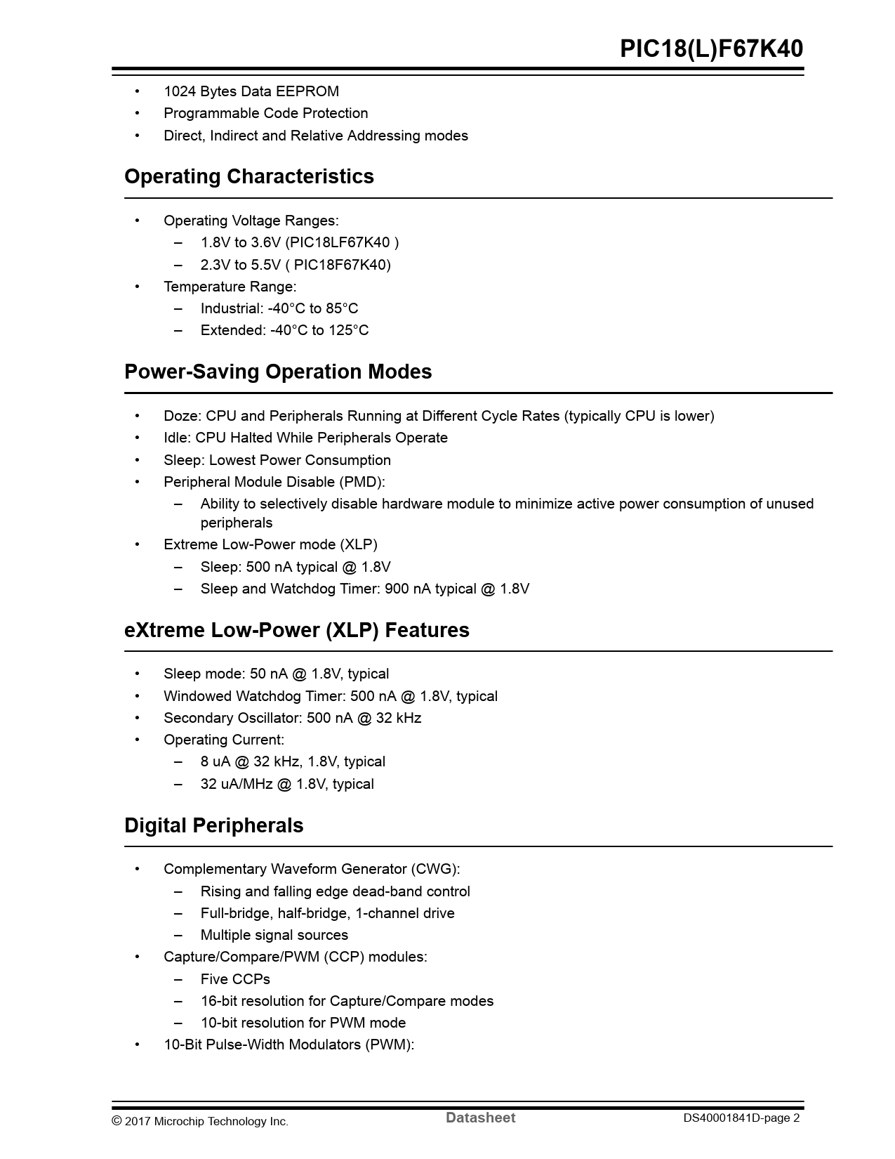 PIC18(L)F67K40. Operating Characteristics. Power-Saving Operation Modes. eXtreme Low-Power (XLP) Features. Digital Peripherals