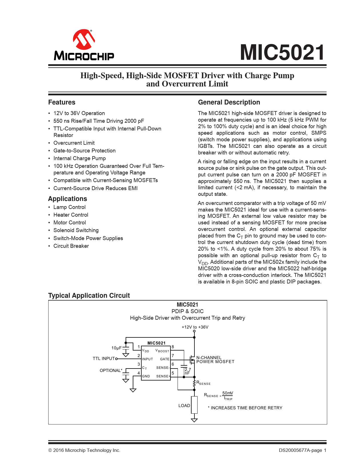 MIC5021 High-Speed, High-Side MOSFET Driver with Charge Pump and Overcurrent Limit Features General Description • 12V to 36V Operation • 550 ns Rise/Fall Time Driving 2000 pF • TTL-Compatible Input with Internal Pull-Down Resistor • Overcurrent Limit • Gate-to-Source Protection • Internal Charge Pump • 100 kHz Operation Guaranteed Over Full Temperature and Operating Voltage Range • Compatible with Current-Sensing MOSFETs • Current-Source Drive Reduces EMI The MIC5021 high-side MOSFET driver is designed to operate at frequencies up to 100 kHz (5 kHz PWM for 2% to 100% duty cycle) and is an ideal choice for high speed applications such as motor control, SMPS (switch mode power supplies), and applications using IGBTs. The MIC5021 can also operate as a circuit breaker with or without automatic retry. A rising or falling edge on the input results in a current source pulse or sink pulse on the gate output. This output current pulse can turn on a 2000 pF MOSFET in approximately 550 ns. The MIC5021 then supplies a limited current (