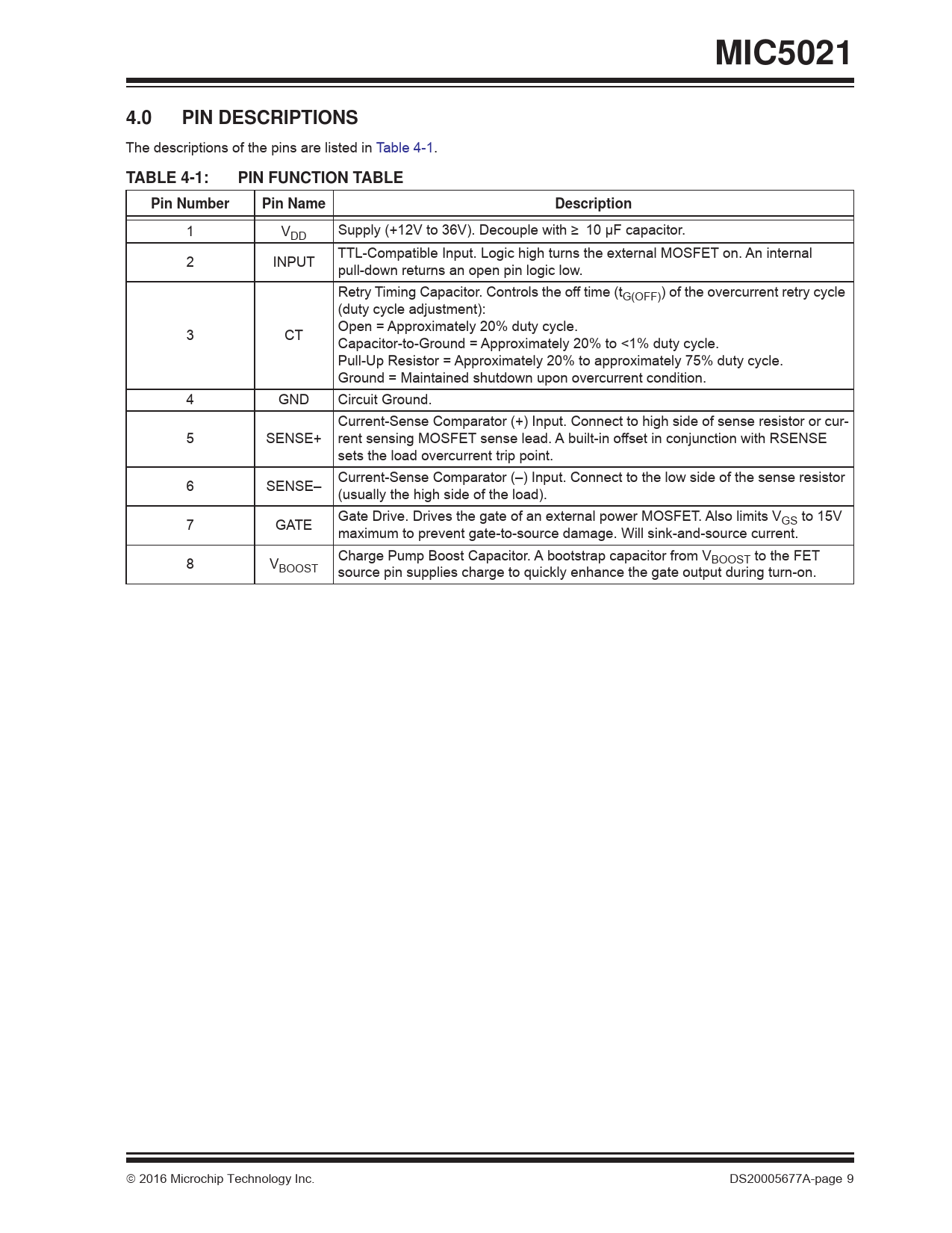 4.0 PIN DESCRIPTIONS The descriptions of the pins are listed in Table 4-1. TABLE 4-1: PIN FUNCTION TABLE Pin Number Pin Name 1 VDD 2 INPUT Description