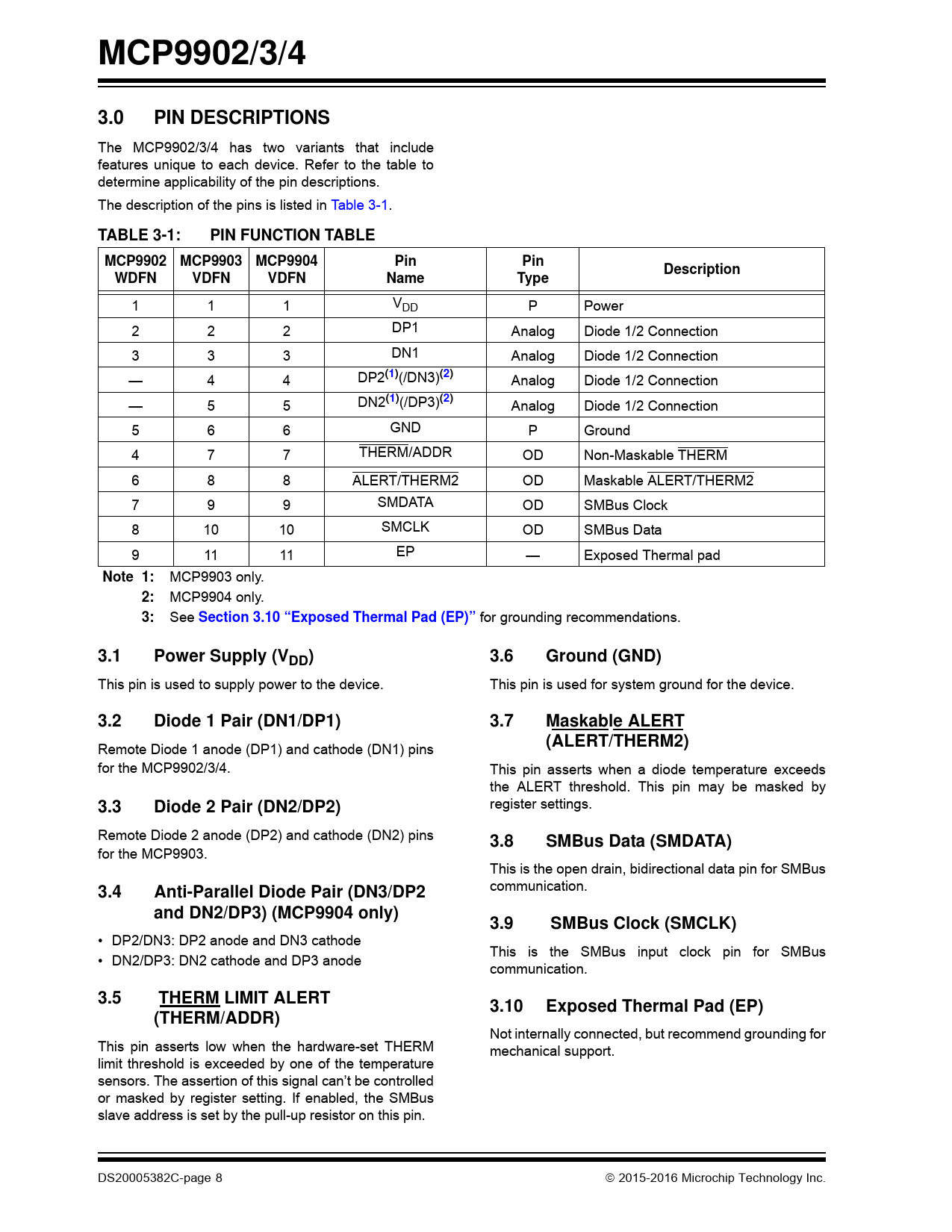 MCP9902/3/4. 3.0. PIN DESCRIPTIONS. TABLE 3-1:. PIN FUNCTION TABLE. MCP9902. MCP9903. MCP9904. Pin. Description. WDFN. VDFN. Name. Type. (1). (2)