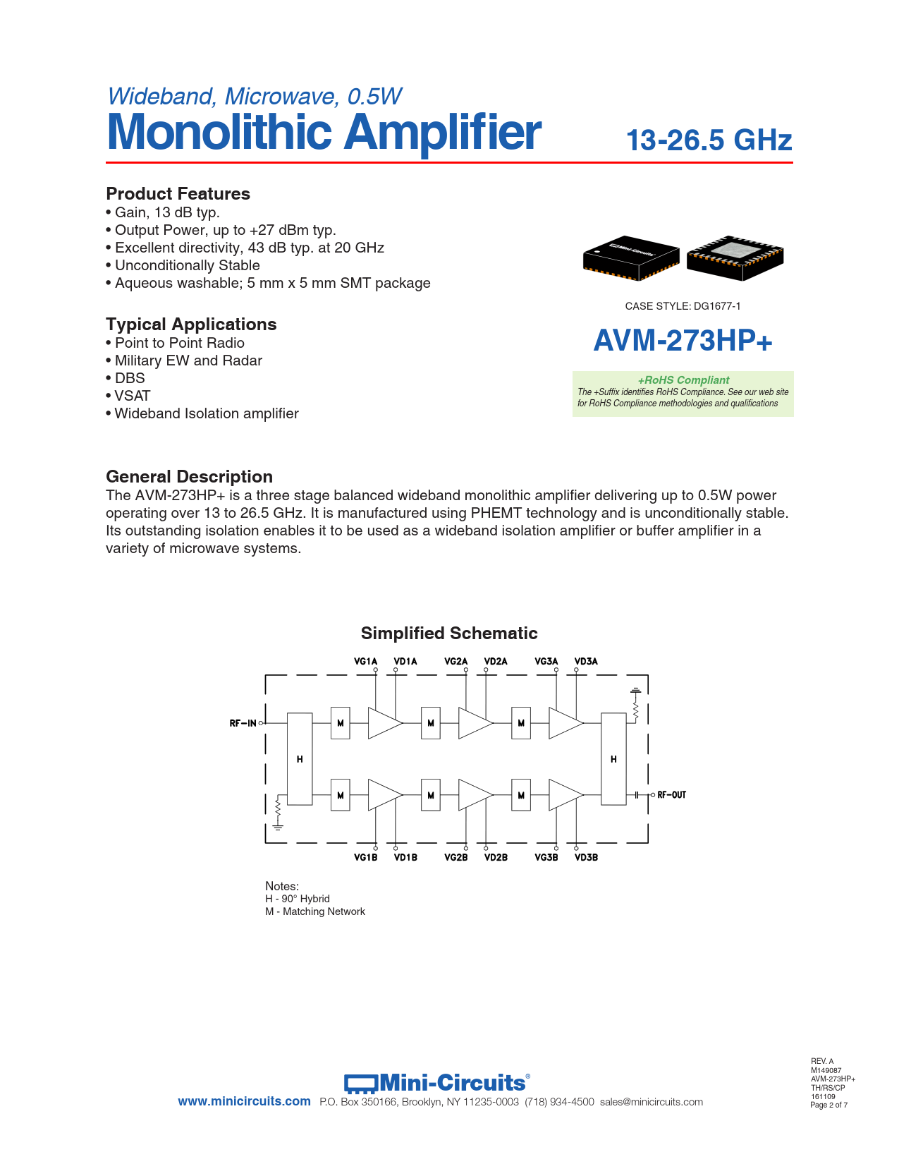 Wideband, Microwave, 0.5W Monolithic Amplifier13-26.5 GHzProduct Features • Gain, 13 dB typ. • Output Power, up to +27 dBm typ. • Excellent directivity, 43 dB typ. at 20 GHz • Unconditionally Stable • Aqueous washable; 5 mm x 5 mm SMT package CASE STYLE: DG1677-1 Typical Applications • Point to Point Radio AVM-273HP+ • Military EW and Radar • DBS +RoHS Compliant • VSAT The +Suffix identifies RoHS Compliance. See our web site for RoHS Compliance methodologies and qualifications • Wideband Isolation amplifier General Description The AVM-273HP+ is a three stage balanced wideband monolithic amplifier delivering up to 0.5W power operating over 13 to 26.5 GHz. It is manufactured using PHEMT technology and is unconditionally stable. Its outstanding isolation enables it to be used as a wideband isolation amplifier or buffer amplifier in a variety of microwave systems. Simplified Schematic Notes: H - 90° Hybrid M - Matching Network Notes A. Performance and quality attributes and conditions not expressly stated in this specification document are intended to be excluded and do not form a part of this specification document. B. Electrical specifications and performance data contained in this specification document are based on Mini-Circuit’s applicable established test performance criteria and measurement instructions. C. The parts covered by this specification document are subject to Mini-Circuits standard limited warranty and terms and conditions (collectively, “Standard Terms”); Purchasers of this part are entitled to the rights and benefits contained therein. For a full statement of the Standard Terms and the exclusive rights and remedies thereunder, please visit Mini-Circuits’ website at www.minicircuits.com/MCLStore/terms.jsp REV. A Mini-Circuits M149087 ® AVM-273HP+ TH/RS/CP www.minicircuits.com P.O. Box 350166, Brooklyn, NY 11235-0003 (718) 934-4500 sales@minicircuits.com 161109 Page 2 of 7 Document Outline AVM-273HP+ Data Sheet View Data View Graphs Case Style PCB Layout Eval Board Enviromental Ratings