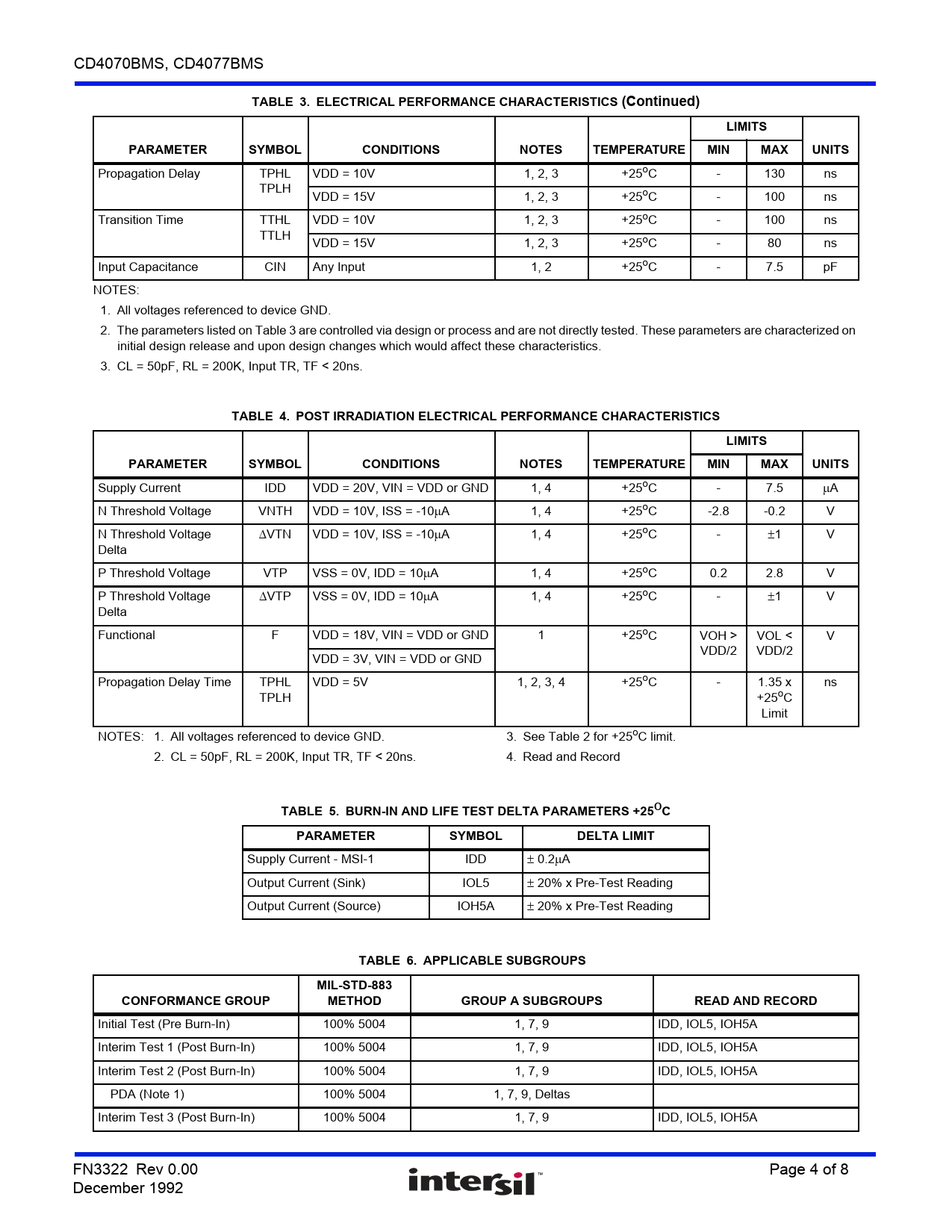 Initial Test (Pre Burn-In) 100% 5004 1, 7, 9 IDD, IOL5, IOH5A Interim Test 1 (Post Burn-In) 100% 5004 1, 7, 9 IDD, IOL5, IOH5A Interim Test 2 (Post Burn-In) 100% 5004 1, 7, 9 IDD, IOL5, IOH5A PDA (Note 1) 100% 5004 1, 7, 9, Deltas Interim Test 3 (Post Burn-In) 100% 5004 1, 7, 9 IDD, IOL5, IOH5A FN3322 Rev 0.00 Page 4 of 8 December 1992