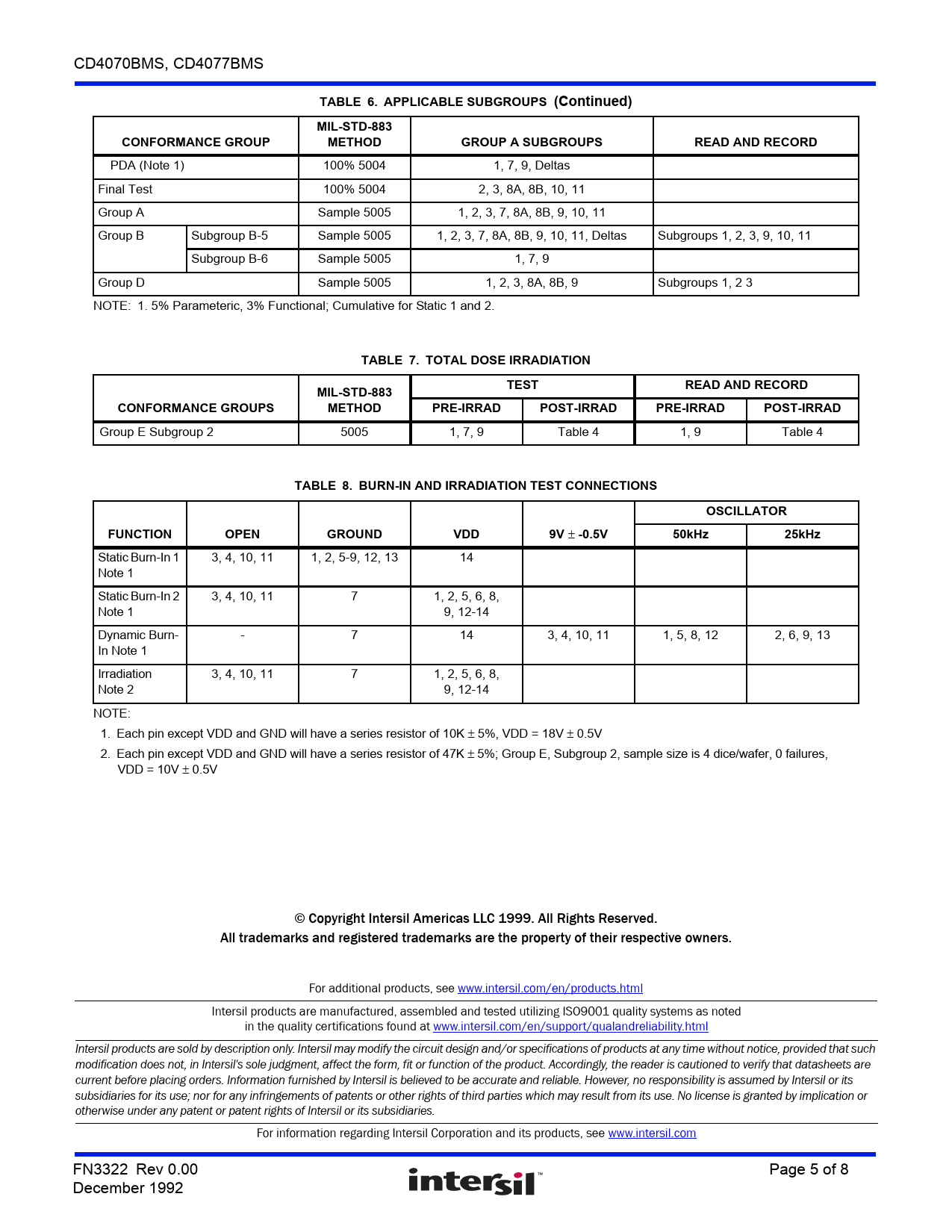 Static Burn-In 1 3, 4, 10, 11 1, 2, 5-9, 12, 13 14 Note 1 Static Burn-In 2 3, 4, 10, 11 7 1, 2, 5, 6, 8, Note 1 9, 12-14 Dynamic Burn- - 7 14 3, 4, 10, 11 1, 5, 8, 12 2, 6, 9, 13 In Note 1 Irradiation 3, 4, 10, 11 7 1, 2, 5, 6, 8, Note 2 9, 12-14 NOTE: 1. Each pin except VDD and GND will have a series resistor of 10K 5%, VDD = 18V 0.5V 2. Each pin except VDD and GND will have a series resistor of 47K 5%; Group E, Subgroup 2, sample size is 4 dice/wafer, 0 failures, VDD = 10V 0.5V © Copyright Intersil Americas LLC 1999. All Rights Reserved. All trademarks and registered trademarks are the property of their respective owners. For additional products, see www.intersil.com/en/products.html Intersil products are manufactured, assembled and tested utilizing ISO9001 quality systems as noted in the quality certifications found at www.intersil.com/en/support/qualandreliability.html Intersil products are sold by description only. Intersil may modify the circuit design and/or specifications of products at any time without notice, provided that such modification does not, in Intersil's sole judgment, affect the form, fit or function of the product. Accordingly, the reader is cautioned to verify that datasheets are current before placing orders. Information furnished by Intersil is believed to be accurate and reliable. However, no responsibility is assumed by Intersil or its subsidiaries for its use; nor for any infringements of patents or other rights of third parties which may result from its use. No license is granted by implication or otherwise under any patent or patent rights of Intersil or its subsidiaries. For information regarding Intersil Corporation and its products, see www.intersil.com FN3322 Rev 0.00 Page 5 of 8 December 1992