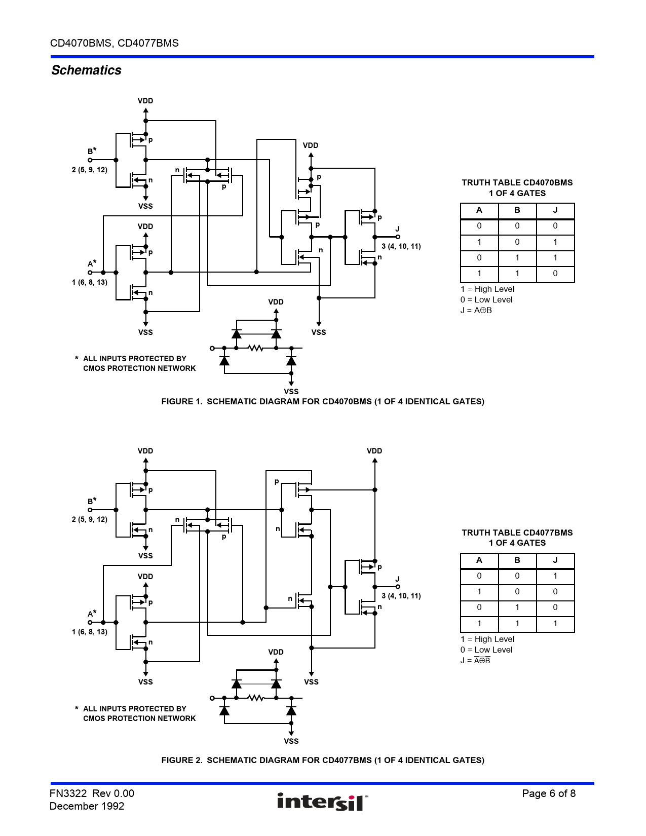 Schematics. VDD. 2 (5, 9, 12). TRUTH TABLE CD4070BMS. 1 OF 4 GATES. VSS. 3 (4, 10, 11). 1 (6, 8, 13). * ALL INPUTS PROTECTED BY