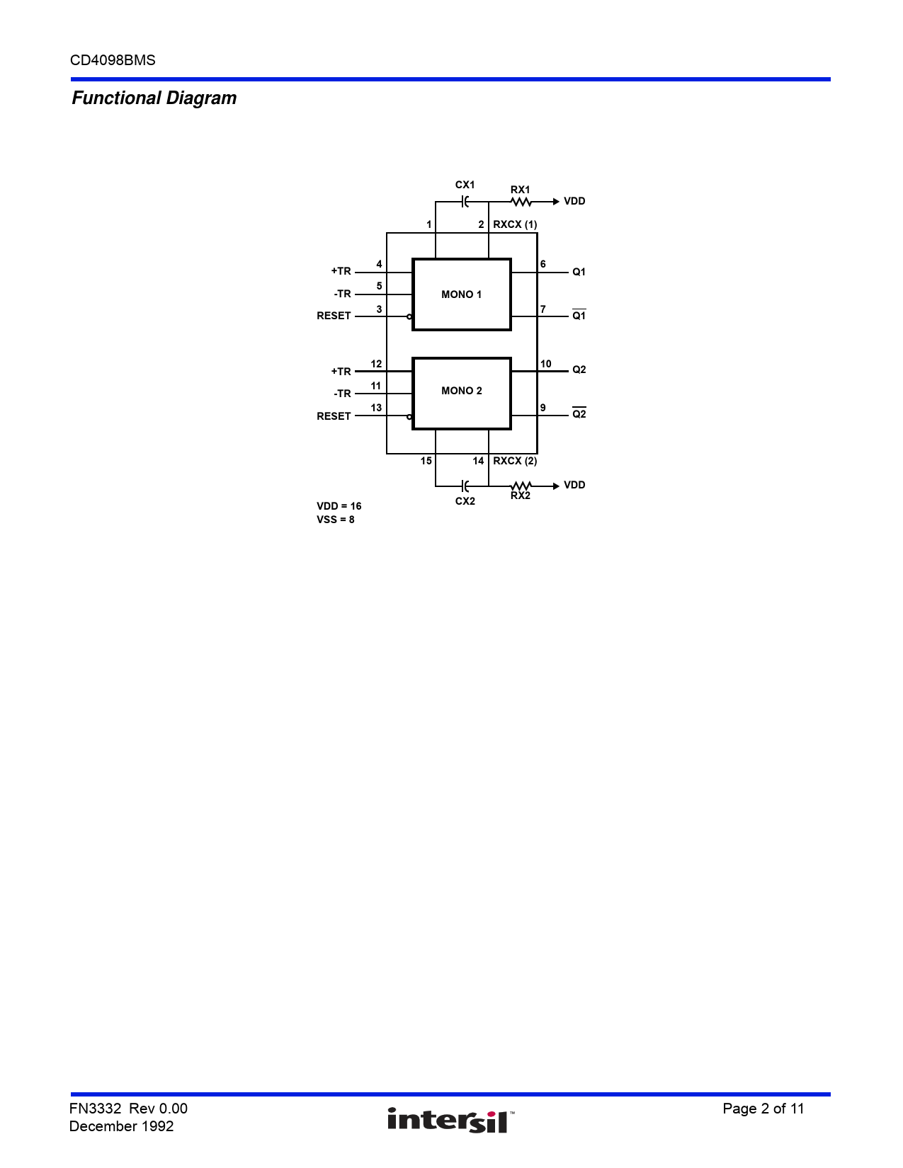 Functional Diagram. CX1. RX1. VDD. 2 RXCX (1). +TR. -TR. MONO 1. RESET. MONO 2. 14 RXCX (2). CX2. RX2. VDD = 16 VSS = 8
