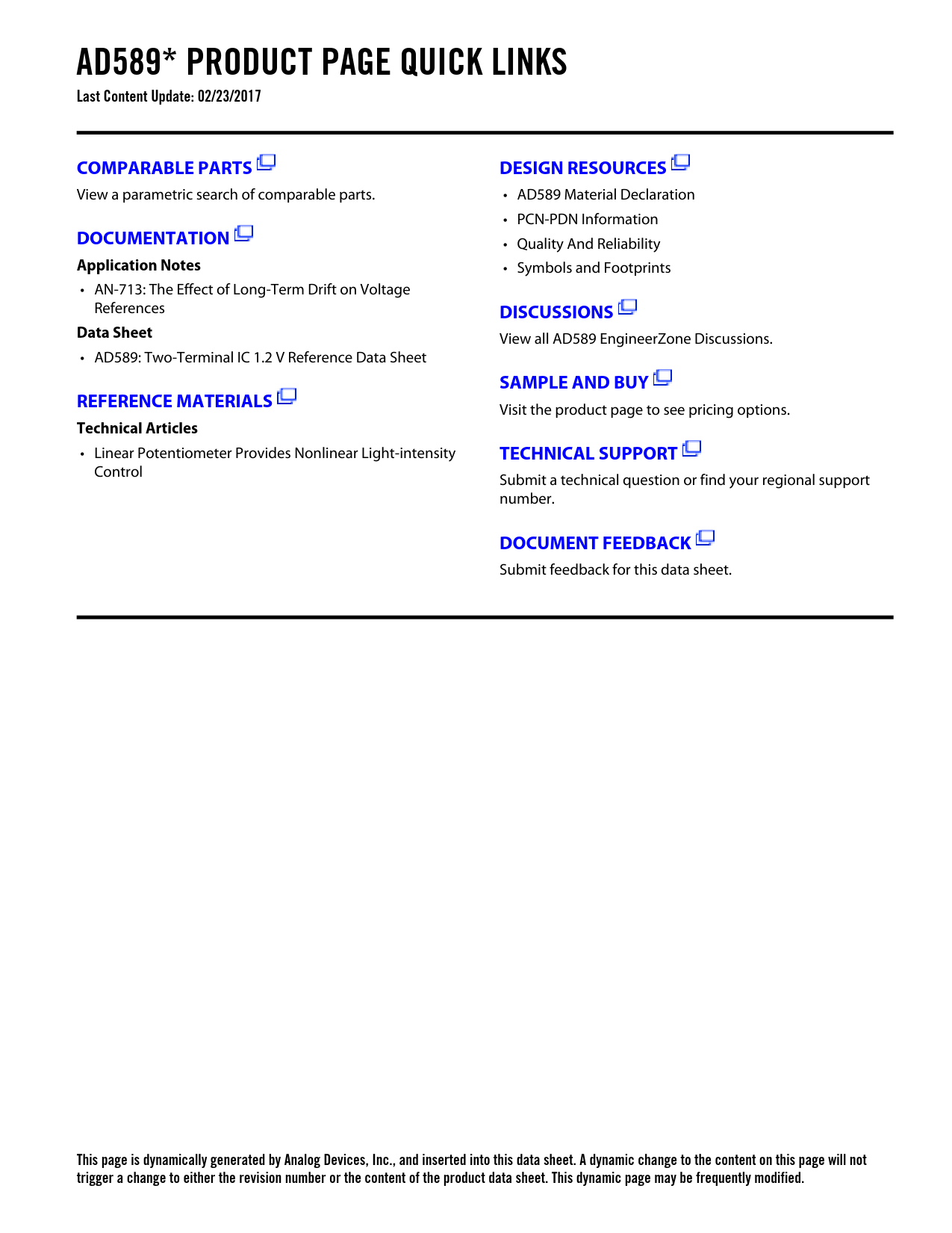AD589* PRODUCT PAGE QUICK LINKS Last Content Update: 02/23/2017COMPARABLE PARTSDESIGN RESOURCES View a parametric search of comparable parts. • AD589 Material Declaration • PCN-PDN Information DOCUMENTATION • Quality And Reliability Application Notes • Symbols and Footprints • AN-713: The Effect of Long-Term Drift on Voltage References DISCUSSIONSData Sheet View all AD589 EngineerZone Discussions. • AD589: Two-Terminal IC 1.2 V Reference Data Sheet SAMPLE AND BUYREFERENCE MATERIALS Visit the product page to see pricing options. Technical Articles • Linear Potentiometer Provides Nonlinear Light-intensity TECHNICAL SUPPORT Control Submit a technical question or find your regional support number. DOCUMENT FEEDBACK Submit feedback for this data sheet. This page is dynamically generated by Analog Devices, Inc., and inserted into this data sheet. A dynamic change to the content on this page will not trigger a change to either the revision number or the content of the product data sheet. This dynamic page may be frequently modified. Document Outline FEATURES PRODUCT DESCRIPTION FUNCTIONAL BLOCK DIAGRAMS PRODUCT HIGHLIGHTS SPECIFICATIONS ABSOLUTE MAXIMUM RATINGS AD589 CHIP DIMENSIONS AND PAD LAYOUT ORDERING GUIDE UNDERSTANDING THE SPECIFICATIONS Voltage Variation Versus Temperature Dynamic Performance APPLICATION INFORMATION OUTLINE DIMENSIONS Revision History