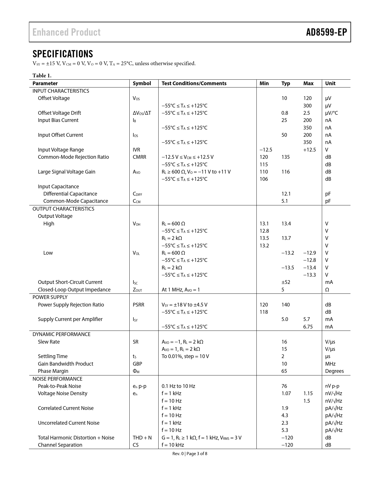 Enhanced Product. AD8599-EP. SPECIFICATIONS. Table 1. Parameter. Symbol. Test Conditions/Comments. Min. Typ. Max. Unit