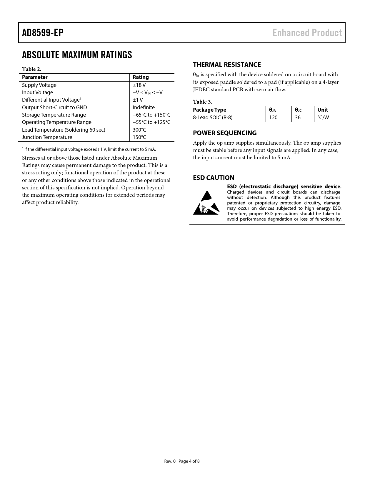 AD8599-EPEnhanced ProductABSOLUTE MAXIMUM RATINGSTHERMAL RESISTANCETable 2. ParameterRating θJA is specified with the device soldered on a circuit board with Supply Voltage ±18 V its exposed paddle soldered to a pad (if applicable) on a 4-layer Input Voltage −V ≤ V JEDEC standard PCB with zero air flow. IN ≤ +V Differential Input Voltage1 ±1 V Table 3. Output Short-Circuit to GND Indefinite Package TypeθJAθJCUnit Storage Temperature Range −65°C to +150°C 8-Lead SOIC (R-8) 120 36 °C/W Operating Temperature Range −55°C to +125°C Lead Temperature (Soldering 60 sec) 300°C POWER SEQUENCING Junction Temperature 150°C Apply the op amp supplies simultaneously. The op amp supplies 1 If the differential input voltage exceeds 1 V, limit the current to 5 mA. must be stable before any input signals are applied. In any case, Stresses at or above those listed under Absolute Maximum the input current must be limited to 5 mA. Ratings may cause permanent damage to the product. This is a stress rating only; functional operation of the product at these or any other conditions above those indicated in the operational ESD CAUTION section of this specification is not implied. Operation beyond the maximum operating conditions for extended periods may affect product reliability. Rev. 0 | Page 4 of 8 Document Outline FEATURES ENHANCED PRODUCT FEATURES APPLICATIONS PIN CONFIGURATION GENERAL DESCRIPTION REVISION HISTORY SPECIFICATIONS ABSOLUTE MAXIMUM RATINGS THERMAL RESISTANCE POWER SEQUENCING ESD CAUTION TYPICAL PERFORMANCE CHARACTERISTICS OUTLINE DIMENSIONS ORDERING GUIDE