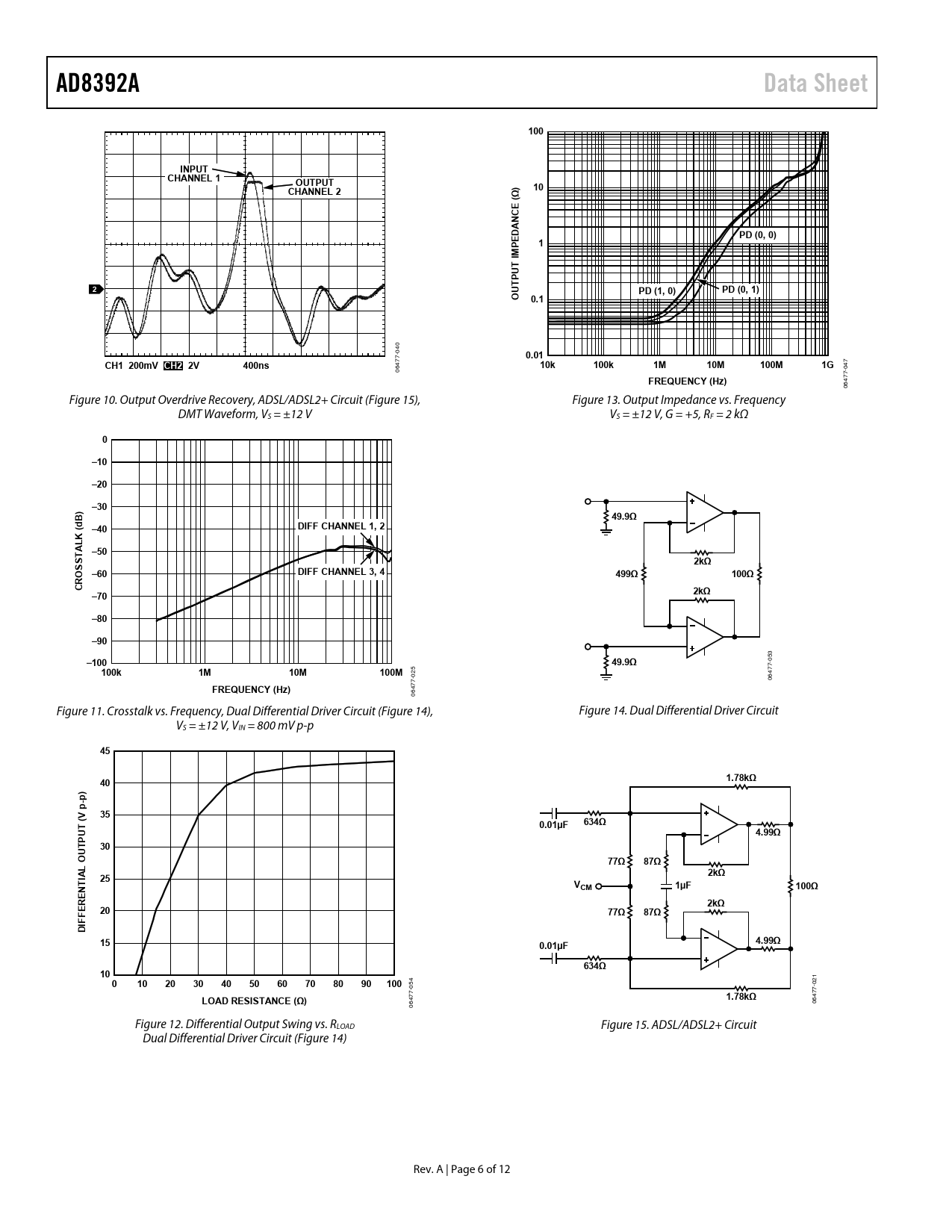 47 06 Figure 10. Output Overdrive Recovery, ADSL/ADSL2+ Circuit (Figure 15), Figure 13. Output Impedance vs. Frequency DMT Waveform, VS = ±12 V VS = ±12 V, G = +5, RF = 2 kΩ