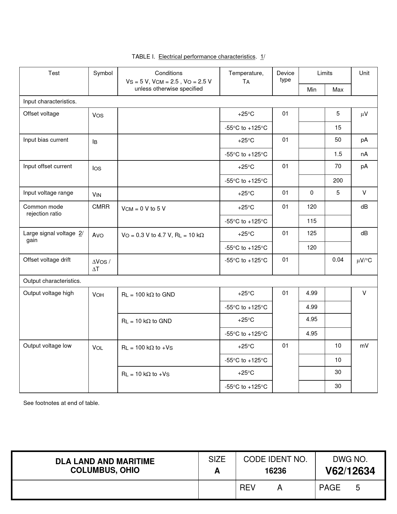 TABLE I. Electrical performance characteristics. 1/ Test Symbol Conditions Temperature, Device Limits Unit VS = 5 V, VCM = 2.5 , VO = 2.5 V TA type unless otherwise specified Min Max Input characteristics. Offset voltage VOS +25C 01 5 V -55C to +125C 15 Input bias current IB +25C 01 50 pA -55C to +125C 1.5 nA Input offset current IOS +25C 01 70 pA -55C to +125C 200 Input voltage range VIN +25C 01 0 5 V Common mode CMRR VCM = 0 V to 5 V +25C 01 120 dB rejection ratio -55C to +125C 115 Large signal voltage 2/ AVO VO = 0.3 V to 4.7 V, RL = 10 k +25C 01 125 dB gain -55C to +125C 120 Offset voltage drift VOS / -55C to +125C 01 0.04 V/C T Output characteristics. Output voltage high VOH RL = 100 k to GND +25C 01 4.99 V -55C to +125C 4.99 RL = 10 k to GND +25C 4.95 -55C to +125C 4.95 Output voltage low VOL RL = 100 k to +VS +25C 01 10 mV -55C to +125C 10 RL = 10 k to +VS +25C 30 -55C to +125C 30 See footnotes at end of table.