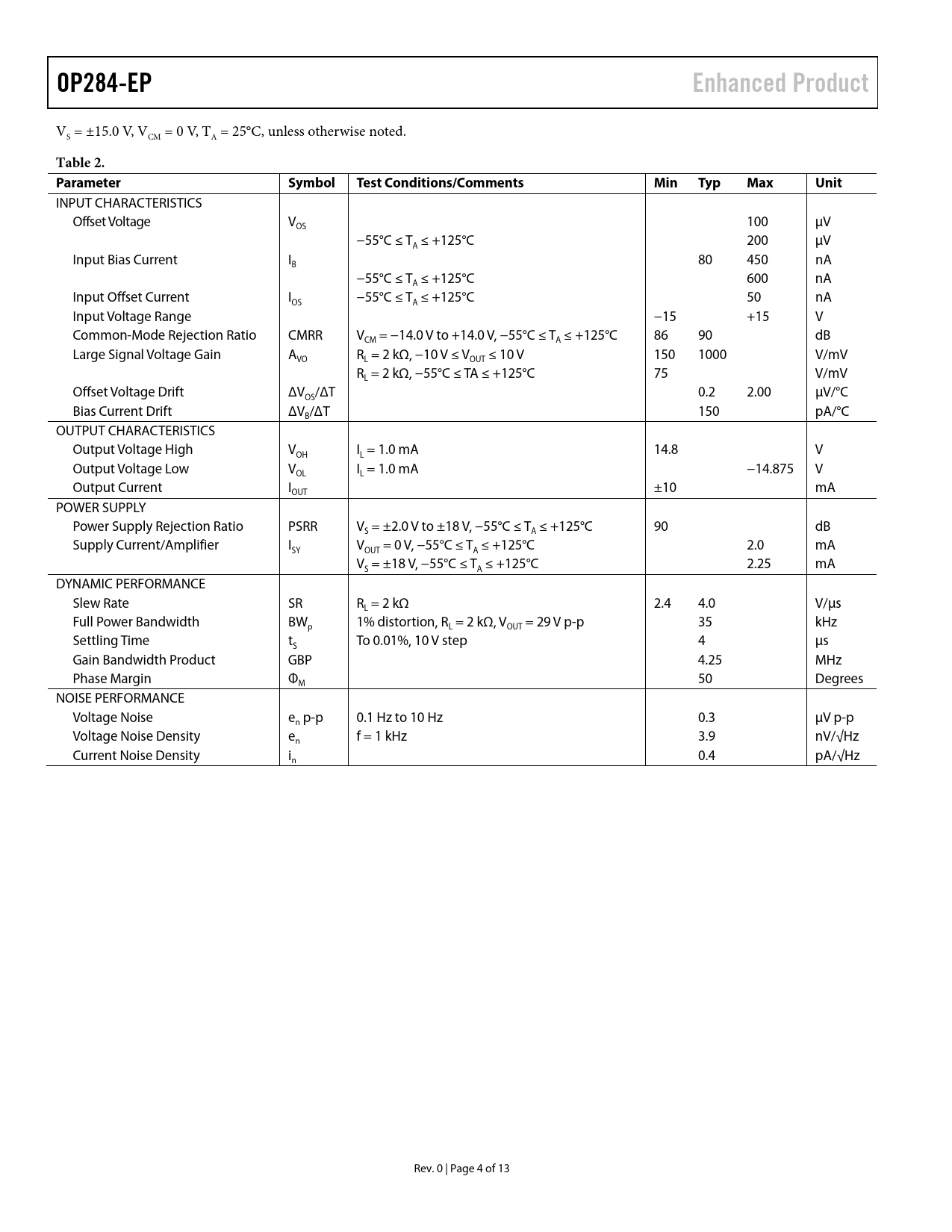 OP284-EPEnhanced Product VS = ±15.0 V, VCM = 0 V, TA = 25°C, unless otherwise noted. Table 2. ParameterSymbolTest Conditions/CommentsMinTypMaxUnit INPUT CHARACTERISTICS Offset Voltage V 100 μV OS −55°C ≤ T ≤ +125°C 200 μV A Input Bias Current I 80 450 nA B −55°C ≤ T ≤ +125°C 600 nA A Input Offset Current I −55°C ≤ T ≤ +125°C 50 nA OS A Input Voltage Range −15 +15 V Common-Mode Rejection Ratio CMRR V = −14.0 V to +14.0 V, −55°C ≤ T ≤ +125°C 86 90 dB CM A Large Signal Voltage Gain A R = 2 kΩ, −10 V ≤ V ≤ 10 V 150 1000 V/mV VO L OUT R = 2 kΩ, −55°C ≤ TA ≤ +125°C 75 V/mV L Offset Voltage Drift ΔV /ΔT 0.2 2.00 µV/°C OS Bias Current Drift ΔV /ΔT 150 pA/°C B OUTPUT CHARACTERISTICS Output Voltage High V I = 1.0 mA 14.8 V OH L Output Voltage Low V I = 1.0 mA −14.875 V OL L Output Current I ±10 mA OUT POWER SUPPLY Power Supply Rejection Ratio PSRR V = ±2.0 V to ±18 V, −55°C ≤ T ≤ +125°C 90 dB S A Supply Current/Amplifier I V = 0 V, −55°C ≤ T ≤ +125°C 2.0 mA SY OUT A V = ±18 V, −55°C ≤ T ≤ +125°C 2.25 mA S A DYNAMIC PERFORMANCE Slew Rate SR R = 2 kΩ 2.4 4.0 V/µs L Full Power Bandwidth BW 1% distortion, R = 2 kΩ, V = 29 V p-p 35 kHz p L OUT Settling Time t To 0.01%, 10 V step 4 µs S Gain Bandwidth Product GBP 4.25 MHz Phase Margin Φ 50 Degrees M NOISE PERFORMANCE Voltage Noise e p-p 0.1 Hz to 10 Hz 0.3 µV p-p n Voltage Noise Density e f = 1 kHz 3.9 nV/√Hz n Current Noise Density i 0.4 pA/√Hz n Rev. 0 | Page 4 of 13 Document Outline FEATURES ENHANCED PRODUCT FEATURES APPLICATIONS PIN CONNECTION DIAGRAM GENERAL DESCRIPTION TABLE OF CONTENTS REVISION HISTORY SPECIFICATIONS ELECTRICAL CHARACTERISTICS ABSOLUTE MAXIMUM RATINGS THERMAL RESISTANCE ESD CAUTION PIN CONFIGURATION AND FUNCTION DESCRIPTIONS TYPICAL PERFORMANCE CHARACTERISTICS OUTLINE DIMENSIONS ORDERING GUIDE