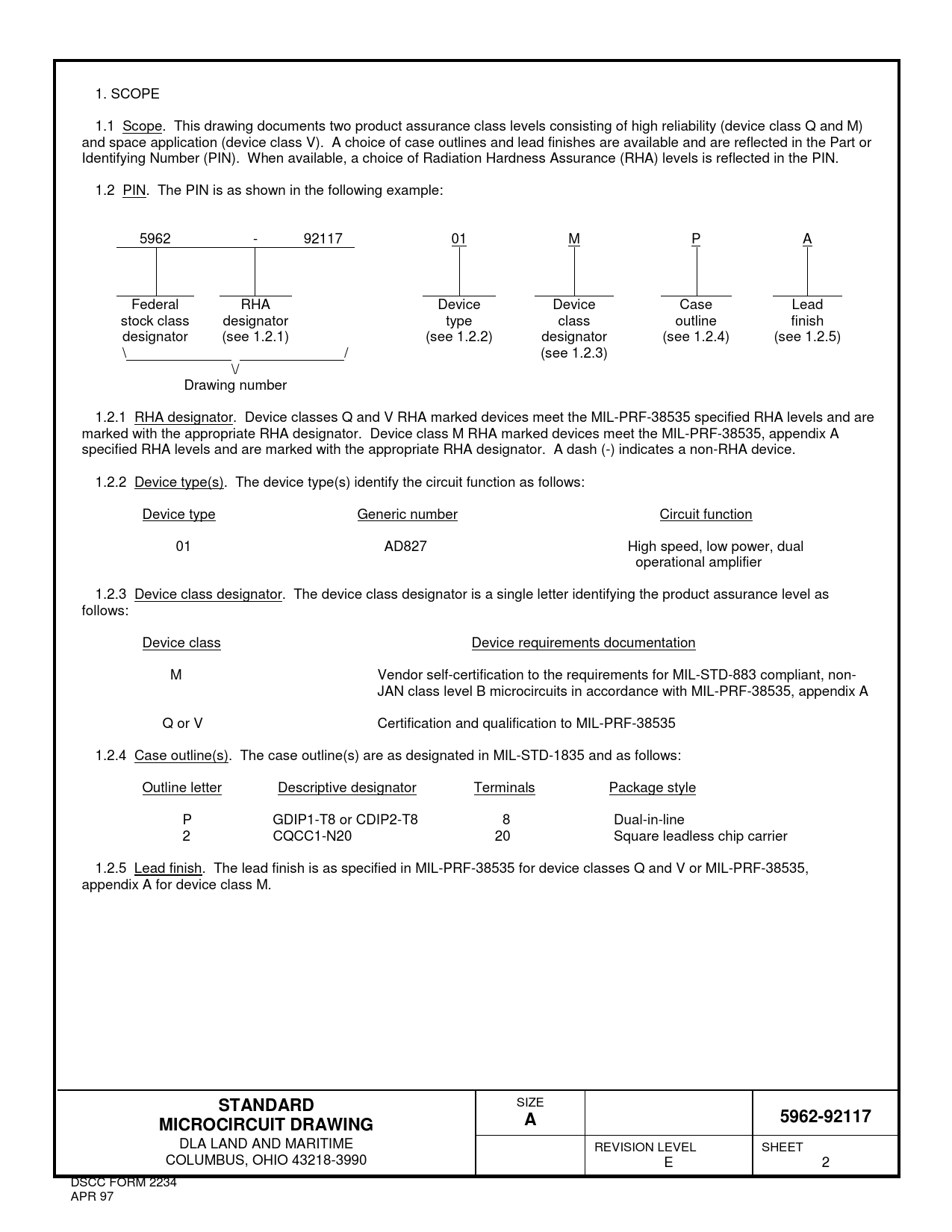 1. SCOPE 1.1 Scope. This drawing documents two product assurance class levels consisting of high reliability (device class Q and M) and space application (device class V). A choice of case outlines and lead finishes are available and are reflected in the Part or Identifying Number (PIN). When available, a choice of Radiation Hardness Assurance (RHA) levels is reflected in the PIN. 1.2 PIN. The PIN is as shown in the following example: 5962 - 92117 01 M P A Federal RHA Device Device Case Lead stock class designator type class outline finish designator (see 1.2.1) (see 1.2.2) designator (see 1.2.4) (see 1.2.5) \ / (see 1.2.3) \/ Drawing number 1.2.1 RHA designator. Device classes Q and V RHA marked devices meet the MIL-PRF-38535 specified RHA levels and are marked with the appropriate RHA designator. Device class M RHA marked devices meet the MIL-PRF-38535, appendix A specified RHA levels and are marked with the appropriate RHA designator. A dash (-) indicates a non-RHA device. 1.2.2 Device type(s). The device type(s) identify the circuit function as follows: Device type Generic number Circuit function 01 AD827 High speed, low power, dual operational amplifier 1.2.3 Device class designator. The device class designator is a single letter identifying the product assurance level as follows: Device class Device requirements documentation M Vendor self-certification to the requirements for MIL-STD-883 compliant, non- JAN class level B microcircuits in accordance with MIL-PRF-38535, appendix A Q or V Certification and qualification to MIL-PRF-38535 1.2.4 Case outline(s). The case outline(s) are as designated in MIL-STD-1835 and as follows: Outline letter Descriptive designator Terminals Package style P GDIP1-T8 or CDIP2-T8 8 Dual-in-line 2 CQCC1-N20 20 Square leadless chip carrier 1.2.5 Lead finish. The lead finish is as specified in MIL-PRF-38535 for device classes Q and V or MIL-PRF-38535, appendix A for device class M. STANDARD SIZE 5962-92117MICROCIRCUIT DRAWINGA DLA LAND AND MARITIME REVISION LEVEL SHEET COLUMBUS, OHIO 43218-3990 E 2 DSCC FORM 2234 APR 97 Document Outline DEPARTMENT OF DEFENSE SPECIFICATION DEPARTMENT OF DEFENSE STANDARDS