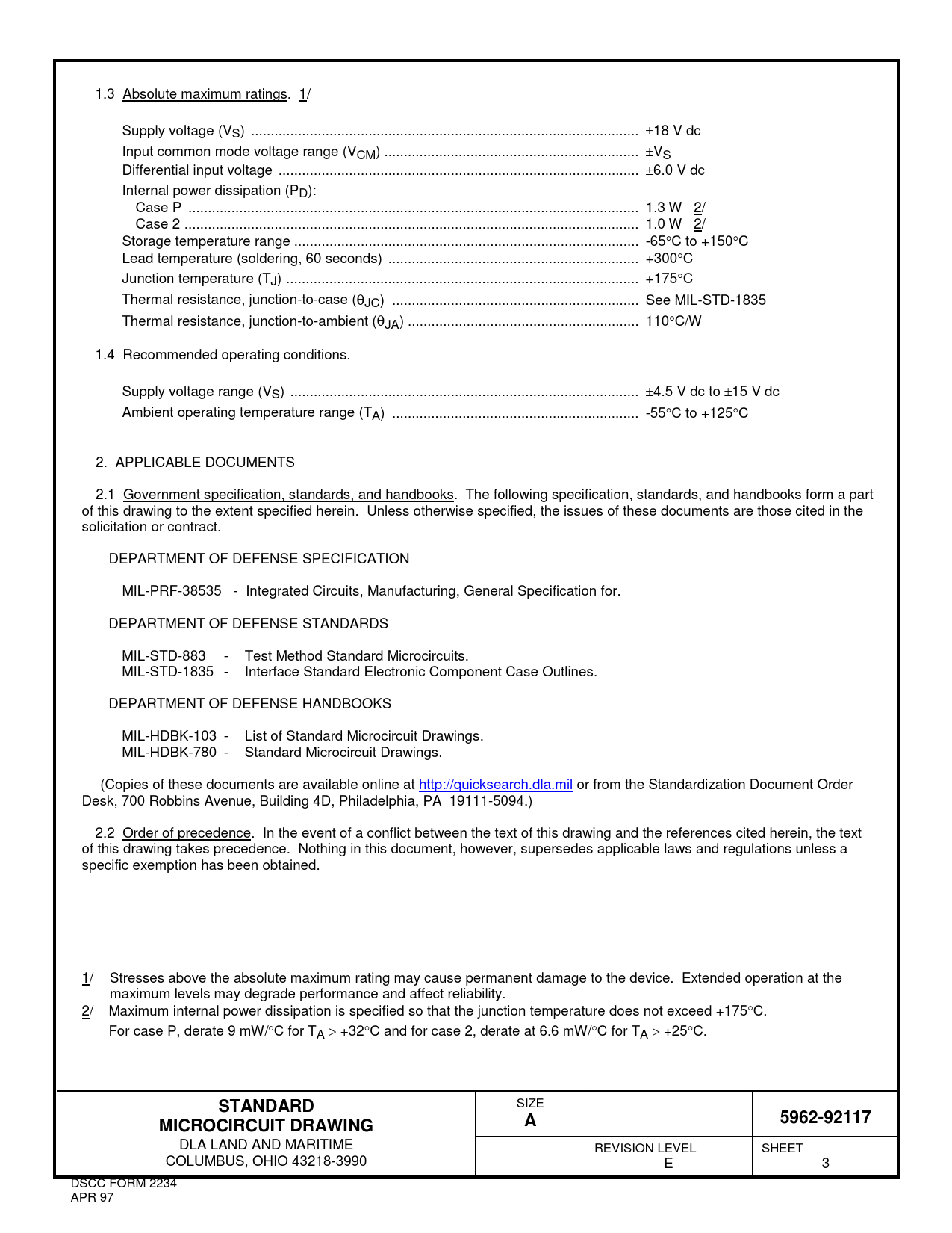 1.3 Absolute maximum ratings. 1/ Supply voltage (VS) ... ±18 V dc Input common mode voltage range (VCM) ... ±VS Differential input voltage .. ±6.0 V dc Internal power dissipation (PD): Case P ... 1.3 W 2/ Case 2 .. 1.0 W 2/ Storage temperature range .. -65°C to +150°C Lead temperature (soldering, 60 seconds) .. +300°C Junction temperature (TJ) .. +175°C Thermal resistance, junction-to-case (θJC) ... See MIL-STD-1835 Thermal resistance, junction-to-ambient (θJA) ... 110°C/W 1.4 Recommended operating conditions. Supply voltage range (VS) ... ±4.5 V dc to ±15 V dc Ambient operating temperature range (TA) ... -55°C to +125°C 2. APPLICABLE DOCUMENTS 2.1 Government specification, standards, and handbooks. The following specification, standards, and handbooks form a part of this drawing to the extent specified herein. Unless otherwise specified, the issues of these documents are those cited in the solicitation or contract. DEPARTMENT OF DEFENSE SPECIFICATION MIL-PRF-38535 - Integrated Circuits, Manufacturing, General Specification for. DEPARTMENT OF DEFENSE STANDARDS MIL-STD-883 - Test Method Standard Microcircuits. MIL-STD-1835 - Interface Standard Electronic Component Case Outlines. DEPARTMENT OF DEFENSE HANDBOOKS MIL-HDBK-103 - List of Standard Microcircuit Drawings. MIL-HDBK-780 - Standard Microcircuit Drawings. (Copies of these documents are available online at http://quicksearch.dla.mil or from the Standardization Document Order Desk, 700 Robbins Avenue, Building 4D, Philadelphia, PA 19111-5094.) 2.2 Order of precedence. In the event of a conflict between the text of this drawing and the references cited herein, the text of this drawing takes precedence. Nothing in this document, however, supersedes applicable laws and regulations unless a specific exemption has been obtained. ______ 1/ Stresses above the absolute maximum rating may cause permanent damage to the device. Extended operation at the maximum levels may degrade performance and affect reliability. 2/ Maximum internal power dissipation is specified so that the junction temperature does not exceed +175°C. For case P, derate 9 mW/°C for TA > +32°C and for case 2, derate at 6.6 mW/°C for TA > +25°C. STANDARD SIZE 5962-92117MICROCIRCUIT DRAWINGA DLA LAND AND MARITIME REVISION LEVEL SHEET COLUMBUS, OHIO 43218-3990 E 3 DSCC FORM 2234 APR 97 Document Outline DEPARTMENT OF DEFENSE SPECIFICATION DEPARTMENT OF DEFENSE STANDARDS