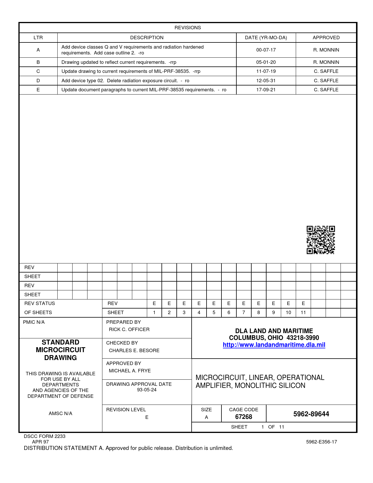 REVISIONS LTR DESCRIPTION DATE (YR-MO-DA) APPROVED Add device classes Q and V requirements and radiation hardened A 00-07-17 R. MONNIN requirements. Add case outline 2. -ro B Drawing updated to reflect current requirements. -rrp 05-01-20 R. MONNIN C Update drawing to current requirements of MIL-PRF-38535. -rrp 11-07-19 C. SAFFLE D Add device type 02. Delete radiation exposure circuit. - ro 12-05-31 C. SAFFLE E Update document paragraphs to current MIL-PRF-38535 requirements. - ro 17-09-21 C. SAFFLE REV SHEET REV SHEET REV STATUS REV E E E E E E E E E E E OF SHEETS SHEET 1 2 3 4 5 6 7 8 9 10 11 PMIC N/A PREPARED BY RICK C. OFFICER DLA LAND AND MARITIMECOLUMBUS, OHIO 43218-3990STANDARD CHECKED BY http://www.landandmaritime.dla.milMICROCIRCUIT CHARLES E. BESORE DRAWING APPROVED BY MICHAEL A. FRYE THIS DRAWING IS AVAILABLE FOR USE BY ALL MICROCIRCUIT, LINEAR, OPERATIONAL DEPARTMENTS DRAWING APPROVAL DATE AMPLIFIER, MONOLITHIC SILICON AND AGENCIES OF THE 93-05-24 DEPARTMENT OF DEFENSE REVISION LEVEL SIZE CAGE CODE AMSC N/A 5962-89644 E A 67268 SHEET 1 OF 11 DSCC FORM 2233 APR 97 5962-E356-17 DISTRIBUTION STATEMENT A. Approved for public release. Distribution is unlimited.