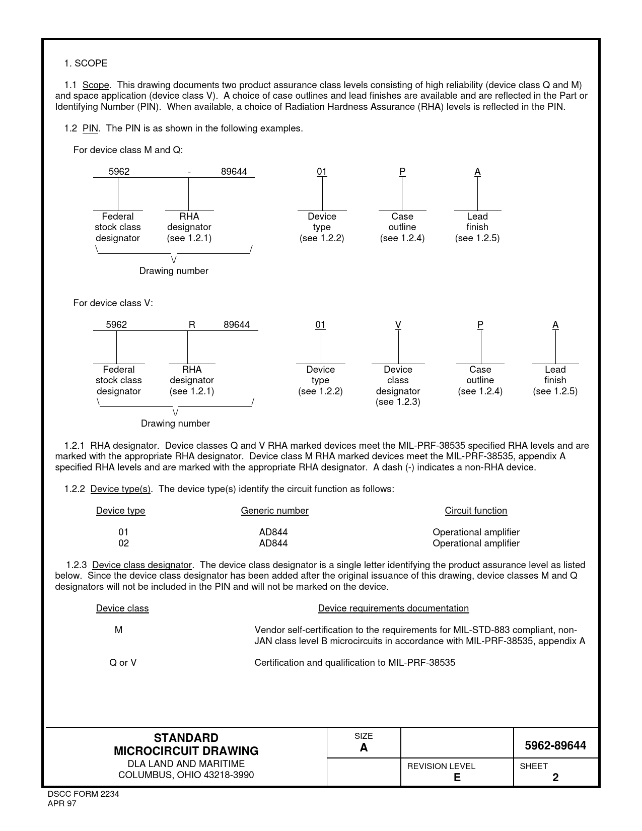 1. SCOPE 1.1 Scope. This drawing documents two product assurance class levels consisting of high reliability (device class Q and M) and space application (device class V). A choice of case outlines and lead finishes are available and are reflected in the Part or Identifying Number (PIN). When available, a choice of Radiation Hardness Assurance (RHA) levels is reflected in the PIN. 1.2 PIN. The PIN is as shown in the following examples. For device class M and Q: 5962 - 89644 01 P A Federal RHA Device Case Lead stock class designator type outline finish designator (see 1.2.1) (see 1.2.2) (see 1.2.4) (see 1.2.5) \ / \/ Drawing number For device class V: 5962 R 89644 01 V P A Federal RHA Device Device Case Lead stock class designator type class outline finish designator (see 1.2.1) (see 1.2.2) designator (see 1.2.4) (see 1.2.5) \ / (see 1.2.3) \/ Drawing number 1.2.1 RHA designator. Device classes Q and V RHA marked devices meet the MIL-PRF-38535 specified RHA levels and are marked with the appropriate RHA designator. Device class M RHA marked devices meet the MIL-PRF-38535, appendix A specified RHA levels and are marked with the appropriate RHA designator. A dash (-) indicates a non-RHA device. 1.2.2 Device type(s). The device type(s) identify the circuit function as follows: Device type Generic number Circuit function 01 AD844 Operational amplifier 02 AD844 Operational amplifier 1.2.3 Device class designator. The device class designator is a single letter identifying the product assurance level as listed below. Since the device class designator has been added after the original issuance of this drawing, device classes M and Q designators will not be included in the PIN and will not be marked on the device. Device class Device requirements documentation M Vendor self-certification to the requirements for MIL-STD-883 compliant, non- JAN class level B microcircuits in accordance with MIL-PRF-38535, appendix A Q or V Certification and qualification to MIL-PRF-38535 STANDARD SIZE 5962-89644MICROCIRCUIT DRAWINGA DLA LAND AND MARITIME REVISION LEVEL SHEET COLUMBUS, OHIO 43218-3990 E2 DSCC FORM 2234 APR 97