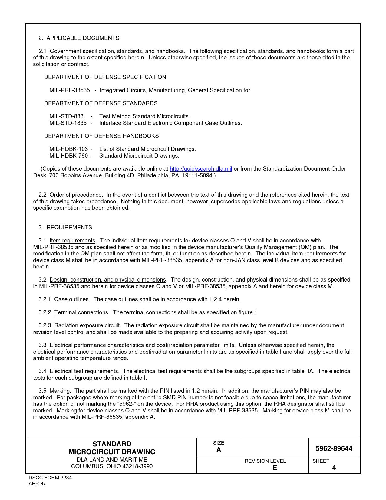 2. APPLICABLE DOCUMENTS 2.1 Government specification, standards, and handbooks. The following specification, standards, and handbooks form a part of this drawing to the extent specified herein. Unless otherwise specified, the issues of these documents are those cited in the solicitation or contract. DEPARTMENT OF DEFENSE SPECIFICATION MIL-PRF-38535 - Integrated Circuits, Manufacturing, General Specification for. DEPARTMENT OF DEFENSE STANDARDS MIL-STD-883 - Test Method Standard Microcircuits. MIL-STD-1835 - Interface Standard Electronic Component Case Outlines. DEPARTMENT OF DEFENSE HANDBOOKS MIL-HDBK-103 - List of Standard Microcircuit Drawings. MIL-HDBK-780 - Standard Microcircuit Drawings. (Copies of these documents are available online at http://quicksearch.dla.mil or from the Standardization Document Order Desk, 700 Robbins Avenue, Building 4D, Philadelphia, PA 19111-5094.) 2.2 Order of precedence. In the event of a conflict between the text of this drawing and the references cited herein, the text of this drawing takes precedence. Nothing in this document, however, supersedes applicable laws and regulations unless a specific exemption has been obtained. 3. REQUIREMENTS 3.1 Item requirements. The individual item requirements for device classes Q and V shall be in accordance with MIL-PRF-38535 and as specified herein or as modified in the device manufacturer's Quality Management (QM) plan. The modification in the QM plan shall not affect the form, fit, or function as described herein. The individual item requirements for device class M shall be in accordance with MIL-PRF-38535, appendix A for non-JAN class level B devices and as specified herein. 3.2 Design, construction, and physical dimensions. The design, construction, and physical dimensions shall be as specified in MIL-PRF-38535 and herein for device classes Q and V or MIL-PRF-38535, appendix A and herein for device class M. 3.2.1 Case outlines. The case outlines shall be in accordance with 1.2.4 herein. 3.2.2 Terminal connections. The terminal connections shall be as specified on figure 1. 3.2.3 Radiation exposure circuit. The radiation exposure circuit shall be maintained by the manufacturer under document revision level control and shall be made available to the preparing and acquiring activity upon request. 3.3 Electrical performance characteristics and postirradiation parameter limits. Unless otherwise specified herein, the electrical performance characteristics and postirradiation parameter limits are as specified in table I and shall apply over the full ambient operating temperature range. 3.4 Electrical test requirements. The electrical test requirements shall be the subgroups specified in table IIA. The electrical tests for each subgroup are defined in table I. 3.5 Marking. The part shall be marked with the PIN listed in 1.2 herein. In addition, the manufacturer's PIN may also be marked. For packages where marking of the entire SMD PIN number is not feasible due to space limitations, the manufacturer has the option of not marking the "5962-" on the device. For RHA product using this option, the RHA designator shall still be marked. Marking for device classes Q and V shall be in accordance with MIL-PRF-38535. Marking for device class M shall be in accordance with MIL-PRF-38535, appendix A. STANDARD SIZE 5962-89644MICROCIRCUIT DRAWINGA DLA LAND AND MARITIME REVISION LEVEL SHEET COLUMBUS, OHIO 43218-3990 E4 DSCC FORM 2234 APR 97