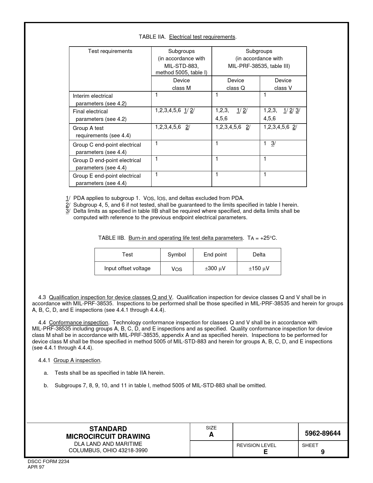 TABLE IIA. Electrical test requirements. Test requirements Subgroups Subgroups (in accordance with (in accordance with MIL-STD-883, MIL-PRF-38535, table III) method 5005, table I) Device Device Device class M class Q class V Interim electrical 1 1 1 parameters (see 4.2) Final electrical 1,2,3,4,5,6 1/ 2/ 1,2,3, 1/ 2/ 1,2,3, 1/ 2/ 3/ parameters (see 4.2) 4,5,6 4,5,6 Group A test 1,2,3,4,5,6 2/ 1,2,3,4,5,6 2/ 1,2,3,4,5,6 2/ requirements (see 4.4) Group C end-point electrical 1 1 1 3/ parameters (see 4.4) Group D end-point electrical 1 1 1 parameters (see 4.4) Group E end-point electrical 1 1 1 parameters (see 4.4) 1/ PDA applies to subgroup 1. VOS, IOS, and deltas excluded from PDA. 2/ Subgroup 4, 5, and 6 if not tested, shall be guaranteed to the limits specified in table I herein. 3/ Delta limits as specified in table IIB shall be required where specified, and delta limits shall be computed with reference to the previous endpoint electrical parameters. TABLE IIB. Burn-in and operating life test delta parameters. TA = +25C. Test Symbol End point Delta Input offset voltage VOS 300 V 150 V 4.3 Qualification inspection for device classes Q and V. Qualification inspection for device classes Q and V shall be in accordance with MIL-PRF-38535. Inspections to be performed shall be those specified in MIL-PRF-38535 and herein for groups A, B, C, D, and E inspections (see 4.4.1 through 4.4.4). 4.4 Conformance inspection. Technology conformance inspection for classes Q and V shall be in accordance with MIL-PRF-38535 including groups A, B, C, D, and E inspections and as specified. Quality conformance inspection for device class M shall be in accordance with MIL-PRF-38535, appendix A and as specified herein. Inspections to be performed for device class M shall be those specified in method 5005 of MIL-STD-883 and herein for groups A, B, C, D, and E inspections (see 4.4.1 through 4.4.4). 4.4.1 Group A inspection. a. Tests shall be as specified in table IIA herein. b. Subgroups 7, 8, 9, 10, and 11 in table I, method 5005 of MIL-STD-883 shall be omitted. STANDARD SIZE 5962-89644MICROCIRCUIT DRAWINGA DLA LAND AND MARITIME REVISION LEVEL SHEET COLUMBUS, OHIO 43218-3990 E9 DSCC FORM 2234 APR 97