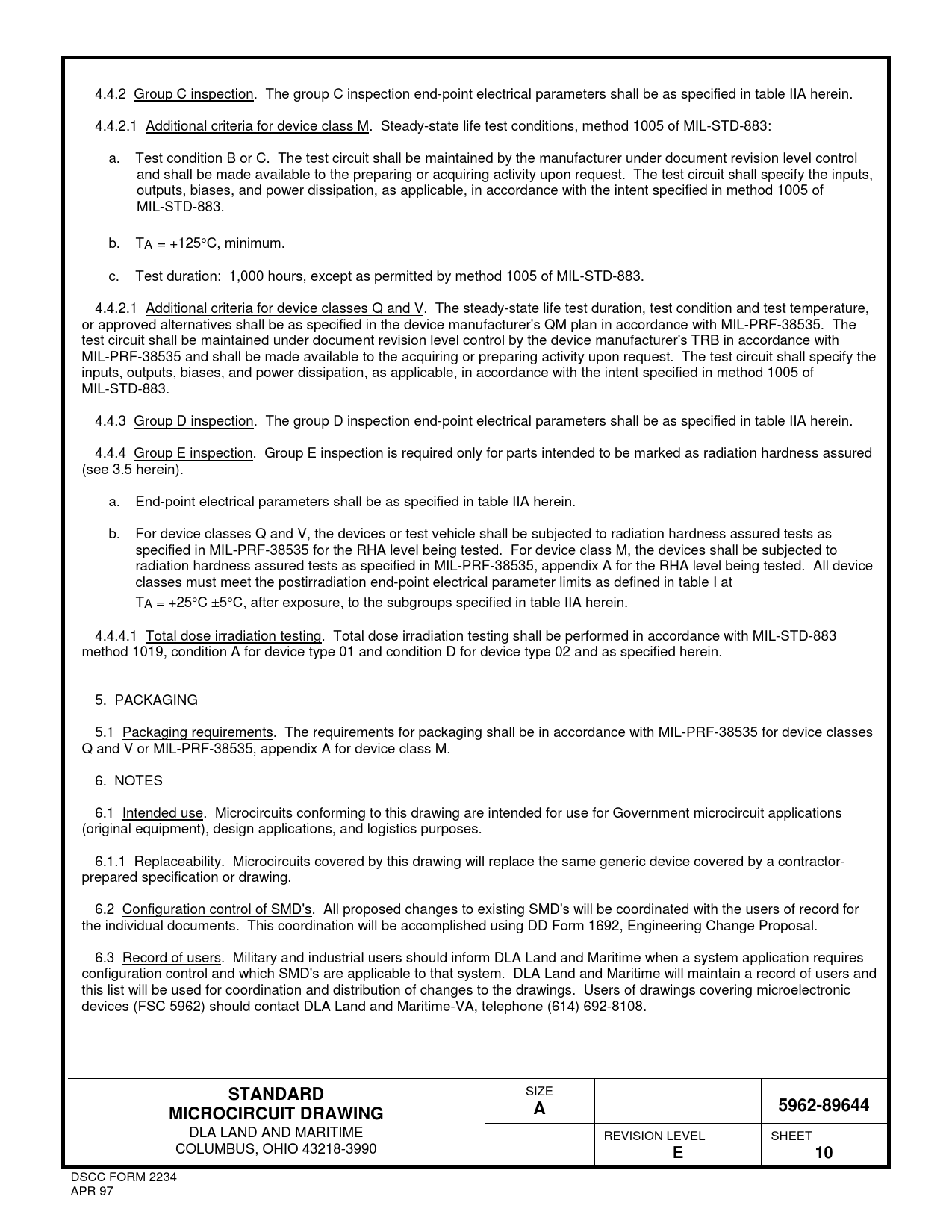 4.4.2 Group C inspection. The group C inspection end-point electrical parameters shall be as specified in table IIA herein. 4.4.2.1 Additional criteria for device class M. Steady-state life test conditions, method 1005 of MIL-STD-883: a. Test condition B or C. The test circuit shall be maintained by the manufacturer under document revision level control and shall be made available to the preparing or acquiring activity upon request. The test circuit shall specify the inputs, outputs, biases, and power dissipation, as applicable, in accordance with the intent specified in method 1005 of MIL-STD-883. b. TA = +125C, minimum. c. Test duration: 1,000 hours, except as permitted by method 1005 of MIL-STD-883. 4.4.2.1 Additional criteria for device classes Q and V. The steady-state life test duration, test condition and test temperature, or approved alternatives shall be as specified in the device manufacturer's QM plan in accordance with MIL-PRF-38535. The test circuit shall be maintained under document revision level control by the device manufacturer's TRB in accordance with MIL-PRF-38535 and shall be made available to the acquiring or preparing activity upon request. The test circuit shall specify the inputs, outputs, biases, and power dissipation, as applicable, in accordance with the intent specified in method 1005 of MIL-STD-883. 4.4.3 Group D inspection. The group D inspection end-point electrical parameters shall be as specified in table IIA herein. 4.4.4 Group E inspection. Group E inspection is required only for parts intended to be marked as radiation hardness assured (see 3.5 herein). a. End-point electrical parameters shall be as specified in table IIA herein. b. For device classes Q and V, the devices or test vehicle shall be subjected to radiation hardness assured tests as specified in MIL-PRF-38535 for the RHA level being tested. For device class M, the devices shall be subjected to radiation hardness assured tests as specified in MIL-PRF-38535, appendix A for the RHA level being tested. All device classes must meet the postirradiation end-point electrical parameter limits as defined in table I at TA = +25C 5C, after exposure, to the subgroups specified in table IIA herein. 4.4.4.1 Total dose irradiation testing. Total dose irradiation testing shall be performed in accordance with MIL-STD-883 method 1019, condition A for device type 01 and condition D for device type 02 and as specified herein. 5. PACKAGING 5.1 Packaging requirements. The requirements for packaging shall be in accordance with MIL-PRF-38535 for device classes Q and V or MIL-PRF-38535, appendix A for device class M. 6. NOTES 6.1 Intended use. Microcircuits conforming to this drawing are intended for use for Government microcircuit applications (original equipment), design applications, and logistics purposes. 6.1.1 Replaceability. Microcircuits covered by this drawing will replace the same generic device covered by a contractor- prepared specification or drawing. 6.2 Configuration control of SMD's. All proposed changes to existing SMD's will be coordinated with the users of record for the individual documents. This coordination will be accomplished using DD Form 1692, Engineering Change Proposal. 6.3 Record of users. Military and industrial users should inform DLA Land and Maritime when a system application requires configuration control and which SMD's are applicable to that system. DLA Land and Maritime will maintain a record of users and this list will be used for coordination and distribution of changes to the drawings. Users of drawings covering microelectronic devices (FSC 5962) should contact DLA Land and Maritime-VA, telephone (614) 692-8108. STANDARD SIZE 5962-89644MICROCIRCUIT DRAWINGA DLA LAND AND MARITIME REVISION LEVEL SHEET COLUMBUS, OHIO 43218-3990 E10 DSCC FORM 2234 APR 97