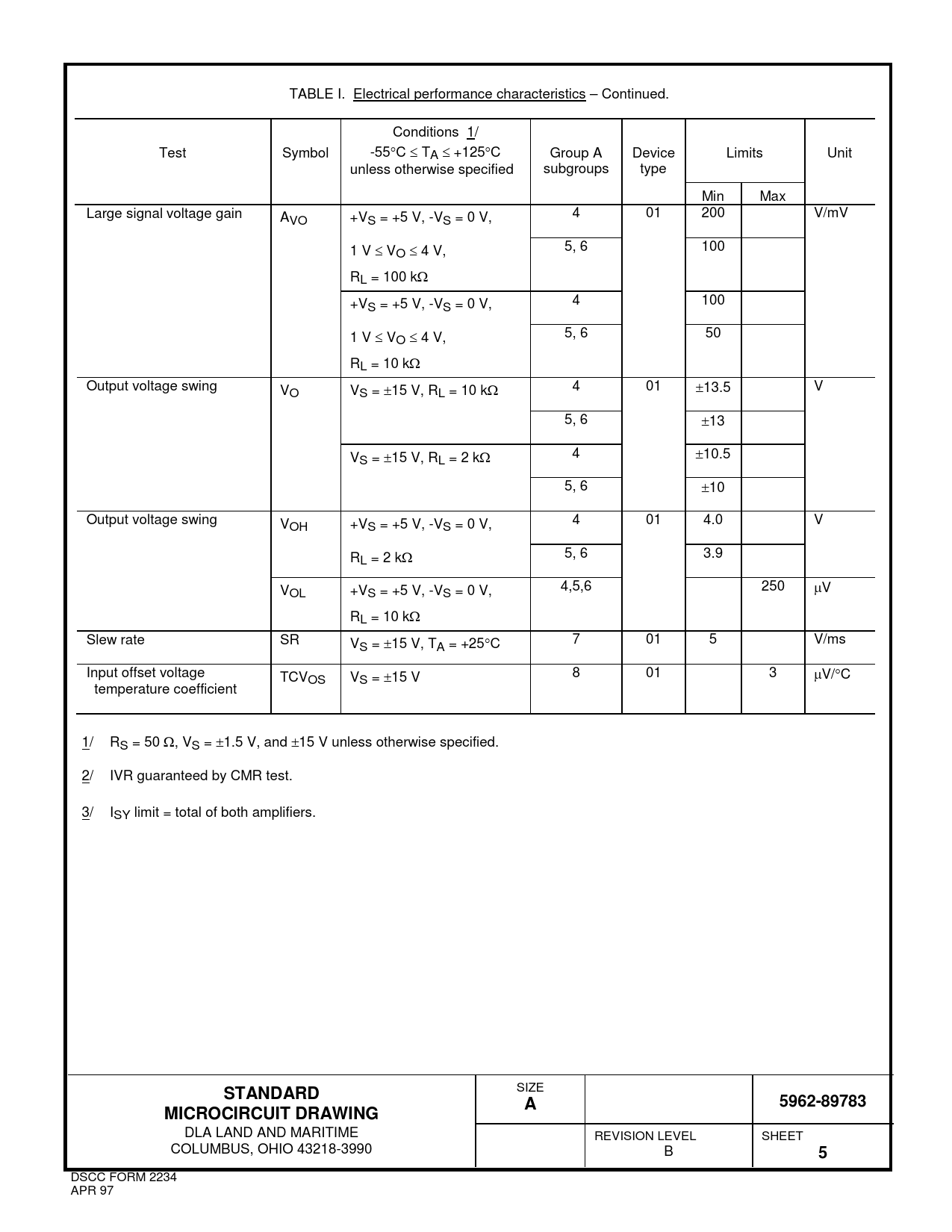 TABLE I. Electrical performance characteristics – Continued. Conditions 1/ Test Symbol -55°C ≤ TA ≤ +125°C Group A Device Limits Unit unless otherwise specified subgroups type Min Max Large signal voltage gain AVO +VS = +5 V, -VS = 0 V, 4 01 200 V/mV 1 V ≤ V 5, 6 100 O ≤ 4 V, RL = 100 kΩ +VS = +5 V, -VS = 0 V, 4 100 1 V ≤ V 5, 6 50 O ≤ 4 V, RL = 10 kΩ Output voltage swing VO VS = ±15 V, RL = 10 kΩ 4 01 ±13.5 V 5, 6 ±13 VS = ±15 V, RL = 2 kΩ 4 ±10.5 5, 6 ±10 Output voltage swing VOH +VS = +5 V, -VS = 0 V, 4 01 4.0 V RL = 2 kΩ 5, 6 3.9 V 4,5,6 250 µV OL +VS = +5 V, -VS = 0 V, RL = 10 kΩ Slew rate SR VS = ±15 V, TA = +25°C 7 01 5 V/ms Input offset voltage TCVOS VS = ±15 V 8 01 3 µV/°C temperature coefficient 1/ RS = 50 Ω, VS = ±1.5 V, and ±15 V unless otherwise specified. 2/ IVR guaranteed by CMR test. 3/ ISY limit = total of both amplifiers. STANDARD SIZE A5962-89783MICROCIRCUIT DRAWING DLA LAND AND MARITIME REVISION LEVEL SHEET COLUMBUS, OHIO 43218-3990 B 5 DSCC FORM 2234 APR 97