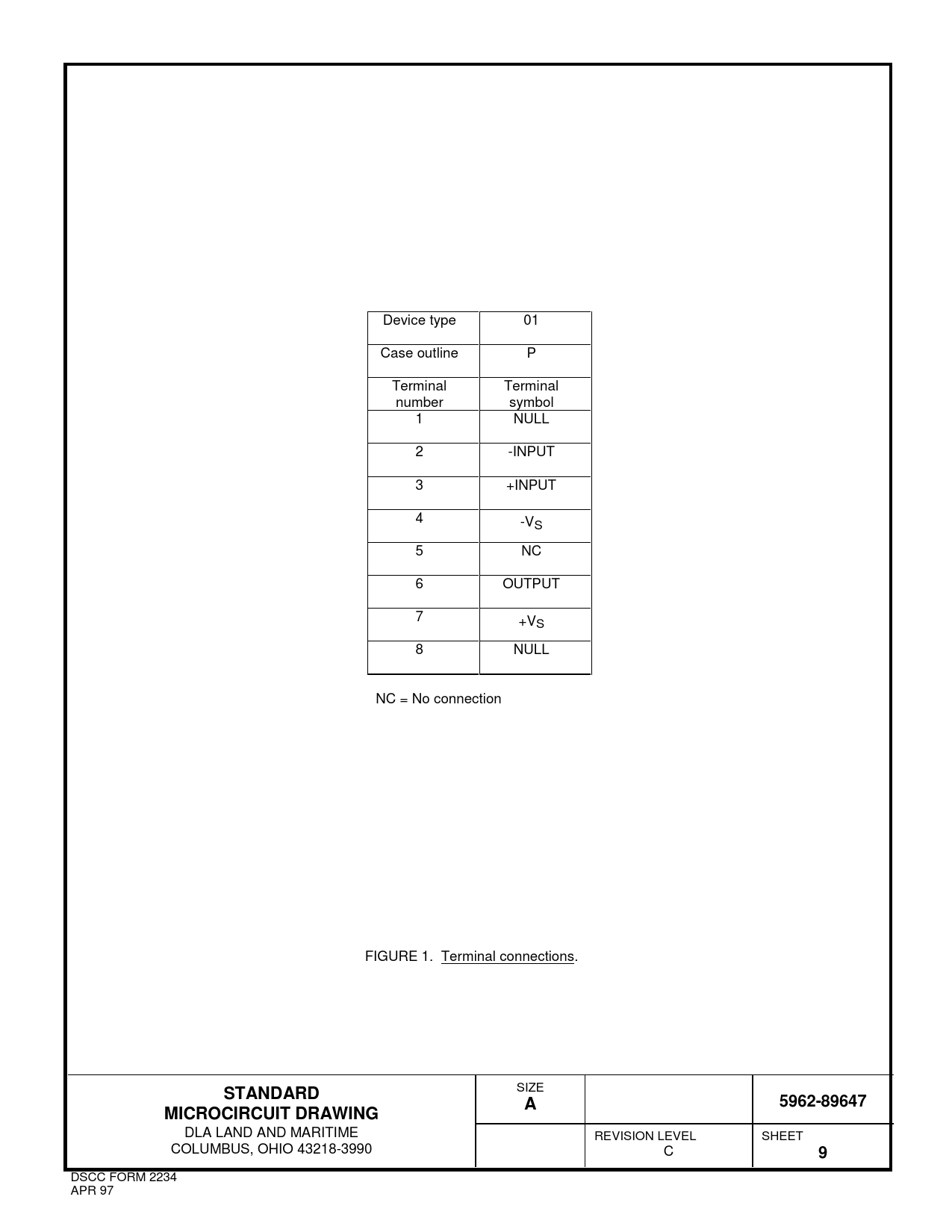 Device type 01 Case outline P Terminal Terminal number symbol 1 NULL 2 -INPUT 3 +INPUT 4 -VS 5 NC 6 OUTPUT 7 +VS 8 NULL NC = No connection FIGURE 1. Terminal connections.