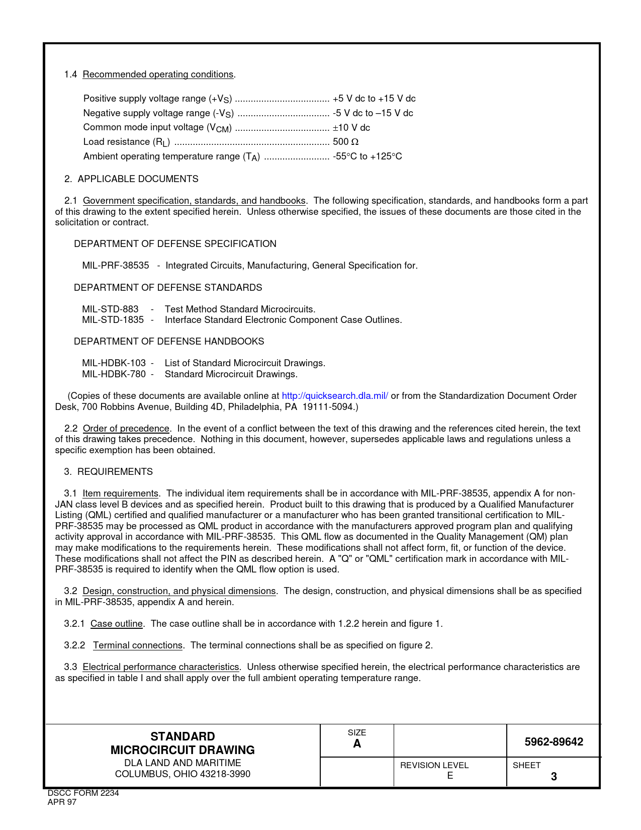 1.4 Recommended operating conditions. Positive supply voltage range (+VS) .. +5 V dc to +15 V dc Negative supply voltage range (-VS) ... -5 V dc to –15 V dc Common mode input voltage (VCM) .. ±10 V dc Load resistance (RL) ... 500 Ω Ambient operating temperature range (TA) ... -55°C to +125°C 2. APPLICABLE DOCUMENTS 2.1 Government specification, standards, and handbooks. The following specification, standards, and handbooks form a part of this drawing to the extent specified herein. Unless otherwise specified, the issues of these documents are those cited in the solicitation or contract. DEPARTMENT OF DEFENSE SPECIFICATION MIL-PRF-38535 - Integrated Circuits, Manufacturing, General Specification for. DEPARTMENT OF DEFENSE STANDARDS MIL-STD-883 - Test Method Standard Microcircuits. MIL-STD-1835 - Interface Standard Electronic Component Case Outlines. DEPARTMENT OF DEFENSE HANDBOOKS MIL-HDBK-103 - List of Standard Microcircuit Drawings. MIL-HDBK-780 - Standard Microcircuit Drawings. (Copies of these documents are available online at http://quicksearch.dla.mil/ or from the Standardization Document Order Desk, 700 Robbins Avenue, Building 4D, Philadelphia, PA 19111-5094.) 2.2 Order of precedence. In the event of a conflict between the text of this drawing and the references cited herein, the text of this drawing takes precedence. Nothing in this document, however, supersedes applicable laws and regulations unless a specific exemption has been obtained. 3. REQUIREMENTS 3.1 Item requirements. The individual item requirements shall be in accordance with MIL-PRF-38535, appendix A for non- JAN class level B devices and as specified herein. Product built to this drawing that is produced by a Qualified Manufacturer Listing (QML) certified and qualified manufacturer or a manufacturer who has been granted transitional certification to MIL- PRF-38535 may be processed as QML product in accordance with the manufacturers approved program plan and qualifying activity approval in accordance with MIL-PRF-38535. This QML flow as documented in the Quality Management (QM) plan may make modifications to the requirements herein. These modifications shall not affect form, fit, or function of the device. These modifications shall not affect the PIN as described herein. A "Q" or "QML" certification mark in accordance with MIL- PRF-38535 is required to identify when the QML flow option is used. 3.2 Design, construction, and physical dimensions. The design, construction, and physical dimensions shall be as specified in MIL-PRF-38535, appendix A and herein. 3.2.1 Case outline. The case outline shall be in accordance with 1.2.2 herein and figure 1. 3.2.2 Terminal connections. The terminal connections shall be as specified on figure 2. 3.3 Electrical performance characteristics. Unless otherwise specified herein, the electrical performance characteristics are as specified in table I and shall apply over the full ambient operating temperature range.