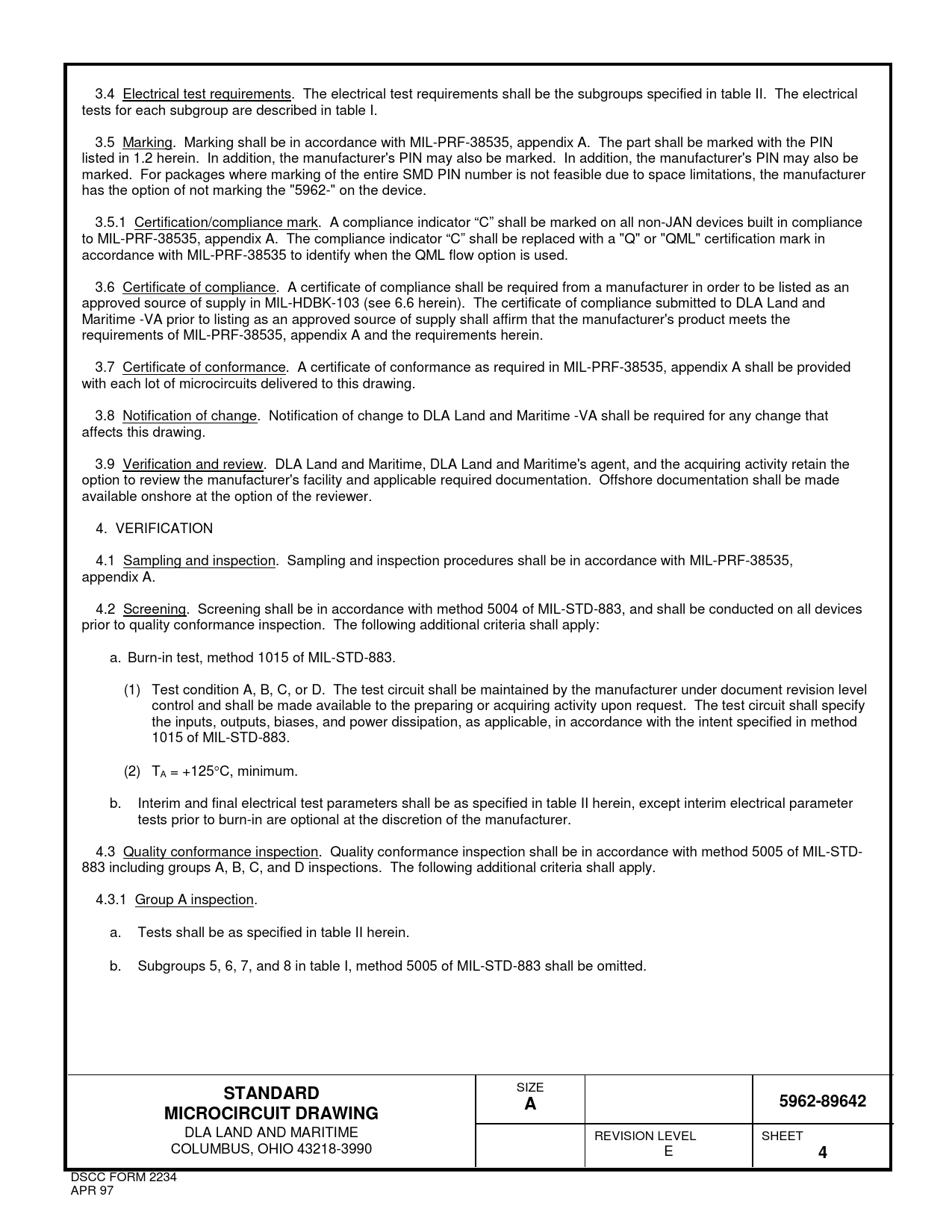 3.4 Electrical test requirements. The electrical test requirements shall be the subgroups specified in table II. The electrical tests for each subgroup are described in table I. 3.5 Marking. Marking shall be in accordance with MIL-PRF-38535, appendix A. The part shall be marked with the PIN listed in 1.2 herein. In addition, the manufacturer's PIN may also be marked. In addition, the manufacturer's PIN may also be marked. For packages where marking of the entire SMD PIN number is not feasible due to space limitations, the manufacturer has the option of not marking the "5962-" on the device. 3.5.1 Certification/compliance mark. A compliance indicator “C” shall be marked on all non-JAN devices built in compliance to MIL-PRF-38535, appendix A. The compliance indicator “C” shall be replaced with a "Q" or "QML" certification mark in accordance with MIL-PRF-38535 to identify when the QML flow option is used. 3.6 Certificate of compliance. A certificate of compliance shall be required from a manufacturer in order to be listed as an approved source of supply in MIL-HDBK-103 (see 6.6 herein). The certificate of compliance submitted to DLA Land and Maritime -VA prior to listing as an approved source of supply shall affirm that the manufacturer's product meets the requirements of MIL-PRF-38535, appendix A and the requirements herein. 3.7 Certificate of conformance. A certificate of conformance as required in MIL-PRF-38535, appendix A shall be provided with each lot of microcircuits delivered to this drawing. 3.8 Notification of change. Notification of change to DLA Land and Maritime -VA shall be required for any change that affects this drawing. 3.9 Verification and review. DLA Land and Maritime, DLA Land and Maritime's agent, and the acquiring activity retain the option to review the manufacturer's facility and applicable required documentation. Offshore documentation shall be made available onshore at the option of the reviewer. 4. VERIFICATION 4.1 Sampling and inspection. Sampling and inspection procedures shall be in accordance with MIL-PRF-38535, appendix A. 4.2 Screening. Screening shall be in accordance with method 5004 of MIL-STD-883, and shall be conducted on all devices prior to quality conformance inspection. The following additional criteria shall apply: a. Burn-in test, method 1015 of MIL-STD-883. (1) Test condition A, B, C, or D. The test circuit shall be maintained by the manufacturer under document revision level control and shall be made available to the preparing or acquiring activity upon request. The test circuit shall specify the inputs, outputs, biases, and power dissipation, as applicable, in accordance with the intent specified in method 1015 of MIL-STD-883. (2) TA = +125°C, minimum. b. Interim and final electrical test parameters shall be as specified in table II herein, except interim electrical parameter tests prior to burn-in are optional at the discretion of the manufacturer. 4.3 Quality conformance inspection. Quality conformance inspection shall be in accordance with method 5005 of MIL-STD- 883 including groups A, B, C, and D inspections. The following additional criteria shall apply. 4.3.1 Group A inspection. a. Tests shall be as specified in table II herein. b. Subgroups 5, 6, 7, and 8 in table I, method 5005 of MIL-STD-883 shall be omitted.