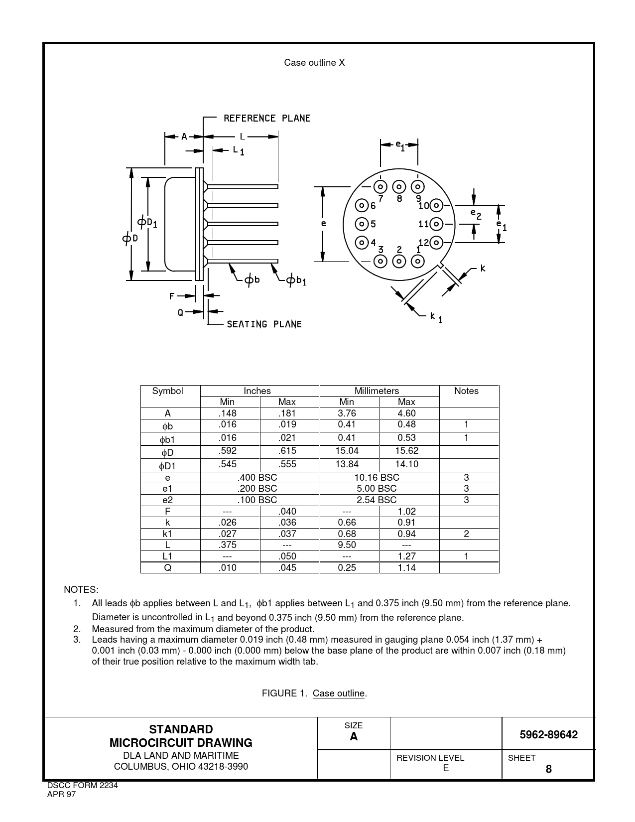 Case outline X Symbol Inches Millimeters Notes Min Max Min Max A .148 .181 3.76 4.60 φb .016 .019 0.41 0.48 1 φb1 .016 .021 0.41 0.53 1 φD .592 .615 15.04 15.62 φD1 .545 .555 13.84 14.10 e .400 BSC 10.16 BSC 3 e1 .200 BSC 5.00 BSC 3 e2 .100 BSC 2.54 BSC 3 F --- .040 --- 1.02 k .026 .036 0.66 0.91 k1 .027 .037 0.68 0.94 2 L .375 --- 9.50 --- L1 --- .050 --- 1.27 1 Q .010 .045 0.25 1.14 NOTES: 1. All leads φb applies between L and L1, φb1 applies between L1 and 0.375 inch (9.50 mm) from the reference plane. Diameter is uncontrolled in L1 and beyond 0.375 inch (9.50 mm) from the reference plane. 2. Measured from the maximum diameter of the product. 3. Leads having a maximum diameter 0.019 inch (0.48 mm) measured in gauging plane 0.054 inch (1.37 mm) + 0.001 inch (0.03 mm) - 0.000 inch (0.000 mm) below the base plane of the product are within 0.007 inch (0.18 mm) of their true position relative to the maximum width tab. FIGURE 1. Case outline. STANDARD SIZE A5962-89642MICROCIRCUIT DRAWING DLA LAND AND MARITIME REVISION LEVEL SHEET COLUMBUS, OHIO 43218-3990 E 8 DSCC FORM 2234 APR 97