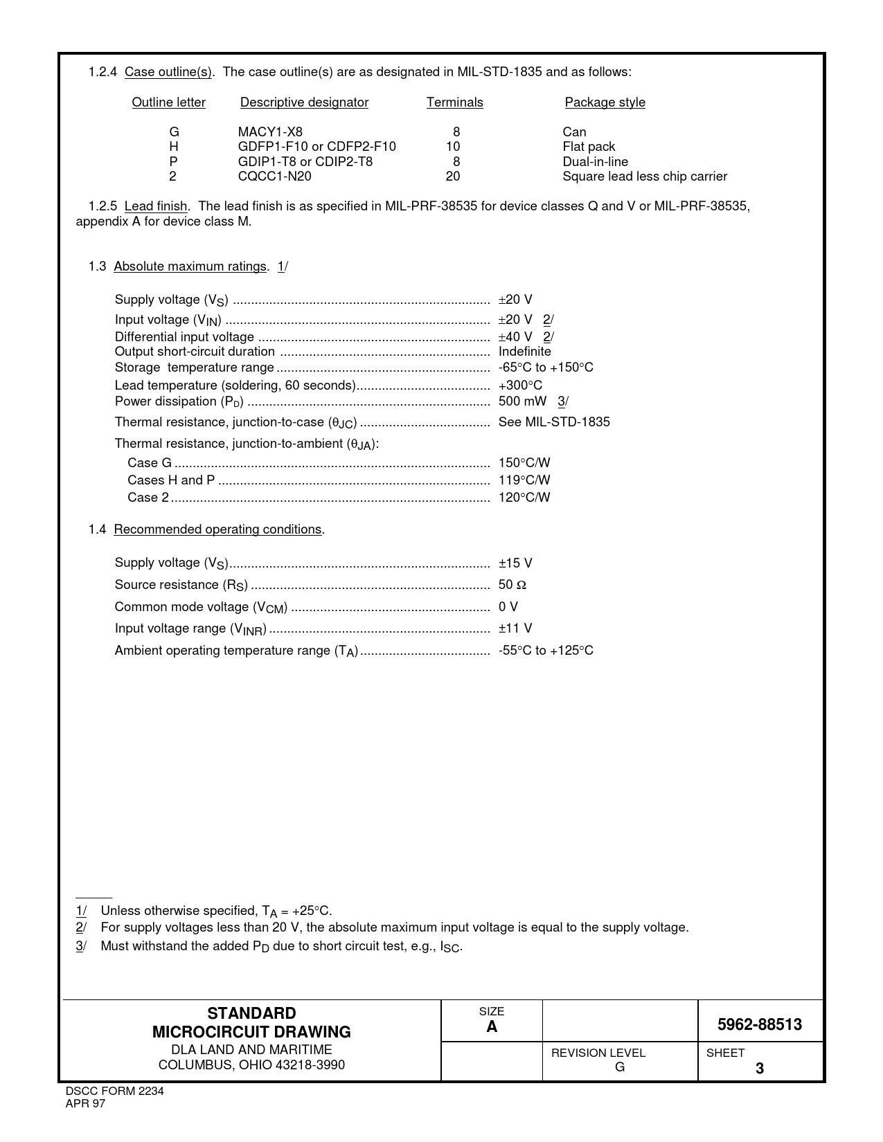 1.2.4 Case outline(s). The case outline(s) are as designated in MIL-STD-1835 and as follows: Outline letter Descriptive designator Terminals Package style G MACY1-X8 8 Can H GDFP1-F10 or CDFP2-F10 10 Flat pack P GDIP1-T8 or CDIP2-T8 8 Dual-in-line 2 CQCC1-N20 20 Square lead less chip carrier 1.2.5 Lead finish. The lead finish is as specified in MIL-PRF-38535 for device classes Q and V or MIL-PRF-38535, appendix A for device class M. 1.3 Absolute maximum ratings. 1/ Supply voltage (VS) ... ±20 V Input voltage (VIN) ... ±20 V 2/ Differential input voltage .. ±40 V 2/ Output short-circuit duration .. Indefinite Storage temperature range ... -65°C to +150°C Lead temperature (soldering, 60 seconds) ... +300°C Power dissipation (PD) ... 500 mW 3/ Thermal resistance, junction-to-case (θJC) .. See MIL-STD-1835 Thermal resistance, junction-to-ambient (θJA): Case G ... 150°C/W Cases H and P ... 119°C/W Case 2 .. 120°C/W 1.4 Recommended operating conditions. Supply voltage (VS) .. ±15 V Source resistance (RS) .. 50 Ω Common mode voltage (VCM) ... 0 V Input voltage range (VINR) ... ±11 V Ambient operating temperature range (TA) .. -55°C to +125°C _____ 1/ Unless otherwise specified, TA = +25°C. 2/ For supply voltages less than 20 V, the absolute maximum input voltage is equal to the supply voltage. 3/ Must withstand the added PD due to short circuit test, e.g., ISC.
