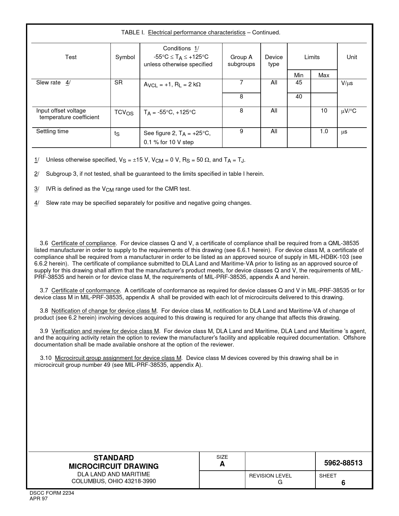 TABLE I. Electrical performance characteristics – Continued. Conditions 1/ Test Symbol -55°C ≤ TA ≤ +125°C Group A Device Limits Unit unless otherwise specified subgroups type Min Max Slew rate 4/ SR AVCL = +1, RL = 2 kΩ 7 All 45 V/µs 8 40 Input offset voltage TCVOS TA = -55°C, +125°C 8 All 10 µV/°C temperature coefficient Settling time t 9 All 1.0 µs S See figure 2, TA = +25°C, 0.1 % for 10 V step 1/ Unless otherwise specified, VS = ±15 V, VCM = 0 V, RS = 50 Ω, and TA = TJ. 2/ Subgroup 3, if not tested, shall be guaranteed to the limits specified in table I herein. 3/ IVR is defined as the VCM range used for the CMR test. 4/ Slew rate may be specified separately for positive and negative going changes. 3.6 Certificate of compliance. For device classes Q and V, a certificate of compliance shall be required from a QML-38535 listed manufacturer in order to supply to the requirements of this drawing (see 6.6.1 herein). For device class M, a certificate of compliance shall be required from a manufacturer in order to be listed as an approved source of supply in MIL-HDBK-103 (see 6.6.2 herein). The certificate of compliance submitted to DLA Land and Maritime-VA prior to listing as an approved source of supply for this drawing shall affirm that the manufacturer's product meets, for device classes Q and V, the requirements of MIL- PRF-38535 and herein or for device class M, the requirements of MIL-PRF-38535, appendix A and herein. 3.7 Certificate of conformance. A certificate of conformance as required for device classes Q and V in MIL-PRF-38535 or for device class M in MIL-PRF-38535, appendix A shall be provided with each lot of microcircuits delivered to this drawing. 3.8 Notification of change for device class M. For device class M, notification to DLA Land and Maritime-VA of change of product (see 6.2 herein) involving devices acquired to this drawing is required for any change that affects this drawing. 3.9 Verification and review for device class M. For device class M, DLA Land and Maritime, DLA Land and Maritime 's agent, and the acquiring activity retain the option to review the manufacturer's facility and applicable required documentation. Offshore documentation shall be made available onshore at the option of the reviewer. 3.10 Microcircuit group assignment for device class M. Device class M devices covered by this drawing shall be in microcircuit group number 49 (see MIL-PRF-38535, appendix A).