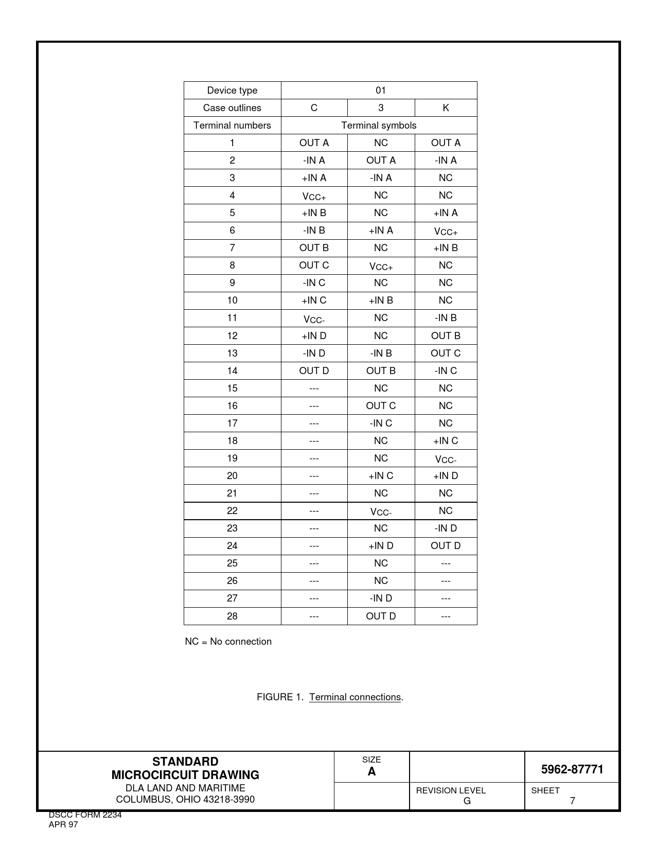 Device type 01 Case outlines C 3 K Terminal numbers Terminal symbols 1 OUT A NC OUT A 2 -IN A OUT A -IN A 3 +IN A -IN A NC 4 VCC+ NC NC 5 +IN B NC +IN A 6 -IN B +IN A VCC+ 7 OUT B NC +IN B 8 OUT C VCC+ NC 9 -IN C NC NC 10 +IN C +IN B NC 11 VCC- NC -IN B 12 +IN D NC OUT B 13 -IN D -IN B OUT C 14 OUT D OUT B -IN C 15 --- NC NC 16 --- OUT C NC 17 --- -IN C NC 18 --- NC +IN C 19 --- NC VCC- 20 --- +IN C +IN D 21 --- NC NC 22 --- VCC- NC 23 --- NC -IN D 24 --- +IN D OUT D 25 --- NC --- 26 --- NC --- 27 --- -IN D --- 28 --- OUT D --- NC = No connection FIGURE 1. Terminal connections.