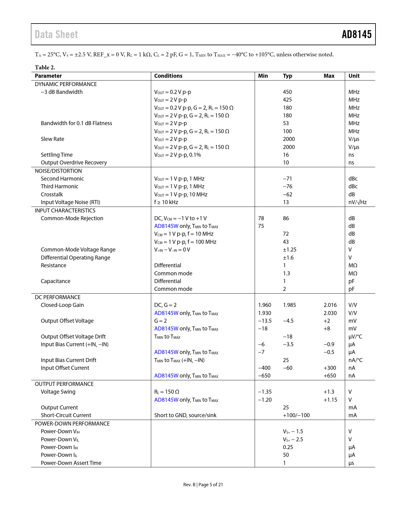 Data SheetAD8145 TA = 25°C, VS = ±2.5 V, REF_x = 0 V, RL = 1 kΩ, CL = 2 pF, G = 1, TMIN to TMAX = −40°C to +105°C, unless otherwise noted. Table 2. ParameterConditionsMinTypMaxUnit DYNAMIC PERFORMANCE −3 dB Bandwidth VOUT = 0.2 V p-p 450 MHz VOUT = 2 V p-p 425 MHz VOUT = 0.2 V p-p, G = 2, RL = 150 Ω 180 MHz VOUT = 2 V p-p, G = 2, RL = 150 Ω 180 MHz Bandwidth for 0.1 dB Flatness VOUT = 2 V p-p 53 MHz VOUT = 2 V p-p, G = 2, RL = 150 Ω 100 MHz Slew Rate VOUT = 2 V p-p 2000 V/µs VOUT = 2 V p-p, G = 2, RL = 150 Ω 2000 V/µs Settling Time VOUT = 2 V p-p, 0.1% 16 ns Output Overdrive Recovery 10 ns NOISE/DISTORTION Second Harmonic VOUT = 1 V p-p, 1 MHz −71 dBc Third Harmonic VOUT = 1 V p-p, 1 MHz −76 dBc Crosstalk VOUT = 1 V p-p, 10 MHz −62 dB Input Voltage Noise (RTI) f ≥ 10 kHz 13 nV/√Hz INPUT CHARACTERISTICS Common-Mode Rejection DC, VCM = −1 V to +1 V 78 86 dB AD8145W only, TMIN to TMAX 75 dB VCM = 1 V p-p, f = 10 MHz 72 dB VCM = 1 V p-p, f = 100 MHz 43 dB Common-Mode Voltage Range V+IN − V−IN = 0 V ±1.25 V Differential Operating Range ±1.6 V Resistance Differential 1 MΩ Common mode 1.3 MΩ Capacitance Differential 1 pF Common mode 2 pF DC PERFORMANCE Closed-Loop Gain DC, G = 2 1.960 1.985 2.016 V/V AD8145W only, TMIN to TMAX 1.930 2.030 V/V Output Offset Voltage G = 2 −13.5 −4.5 +2 mV AD8145W only, TMIN to TMAX −18 +8 mV Output Offset Voltage Drift TMIN to TMAX −18 µV/°C Input Bias Current (+IN, −IN) −6 −3.5 −0.9 µA AD8145W only, TMIN to TMAX −7 −0.5 µA Input Bias Current Drift TMIN to TMAX (+IN, −IN) 25 nA/°C Input Offset Current −400 −60 +300 nA AD8145W only, TMIN to TMAX −650 +650 nA OUTPUT PERFORMANCE Voltage Swing RL = 150 Ω −1.35 +1.3 V AD8145W only, TMIN to TMAX −1.20 +1.15 V Output Current 25 mA Short-Circuit Current Short to GND, source/sink +100/−100 mA POWER-DOWN PERFORMANCE Power-Down VIH VS+ − 1.5 V Power-Down VIL VS+ − 2.5 V Power-Down IIH 0.25 µA Power-Down IIL 50 µA Power-Down Assert Time 1 µs Rev. B | Page 5 of 21 Document Outline FEATURES APPLICATIONS FUNCTIONAL BLOCK DIAGRAM GENERAL DESCRIPTION TABLE OF CONTENTS REVISION HISTORY SPECIFICATIONS ABSOLUTE MAXIMUM RATINGS THERMAL RESISTANCE MAXIMUM POWER DISSIPATION ESD CAUTION PIN CONFIGURATION AND FUNCTION DESCRIPTION TYPICAL PERFORMANCE CHARACTERISTICS THEORY OF OPERATION APPLICATIONS INFORMATION OVERVIEW BASIC CLOSED-LOOP GAIN CONFIGURATIONS TERMINATING THE INPUT INPUT CLAMPING PCB LAYOUT CONSIDERATIONS Minimizing Parasitic Feedback Reactances Maximizing Heat Removal DRIVING A CAPACITIVE LOAD POWER-DOWN COMPARATORS SYNC PULSE EXTRACTION USING COMPARATORS OUTLINE DIMENSIONS ORDERING GUIDE AUTOMOTIVE PRODUCTS