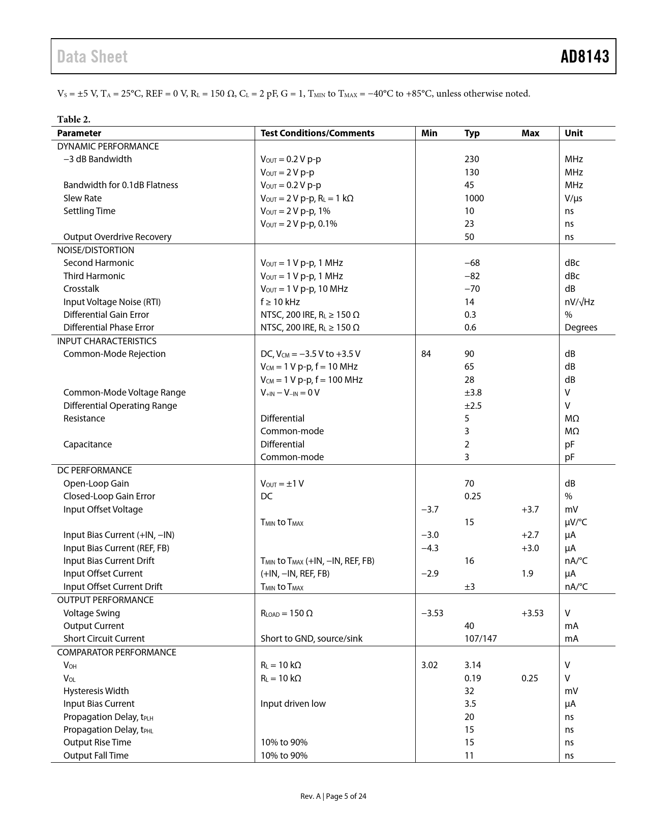 Data Sheet. AD8143. Table 2. Parameter. Test Conditions/Comments. Min. Typ. Max. Unit