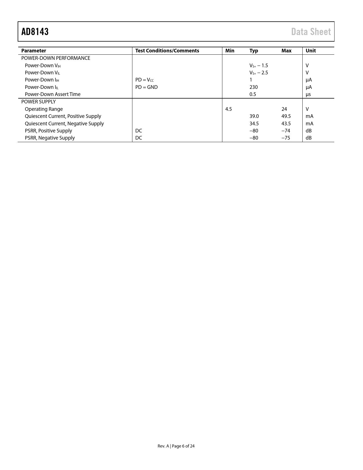 页数 / 页25 / 7 — AD8143. Data Sheet. Parameter. Test Conditions/Comments. Min. Typ. Max. …
