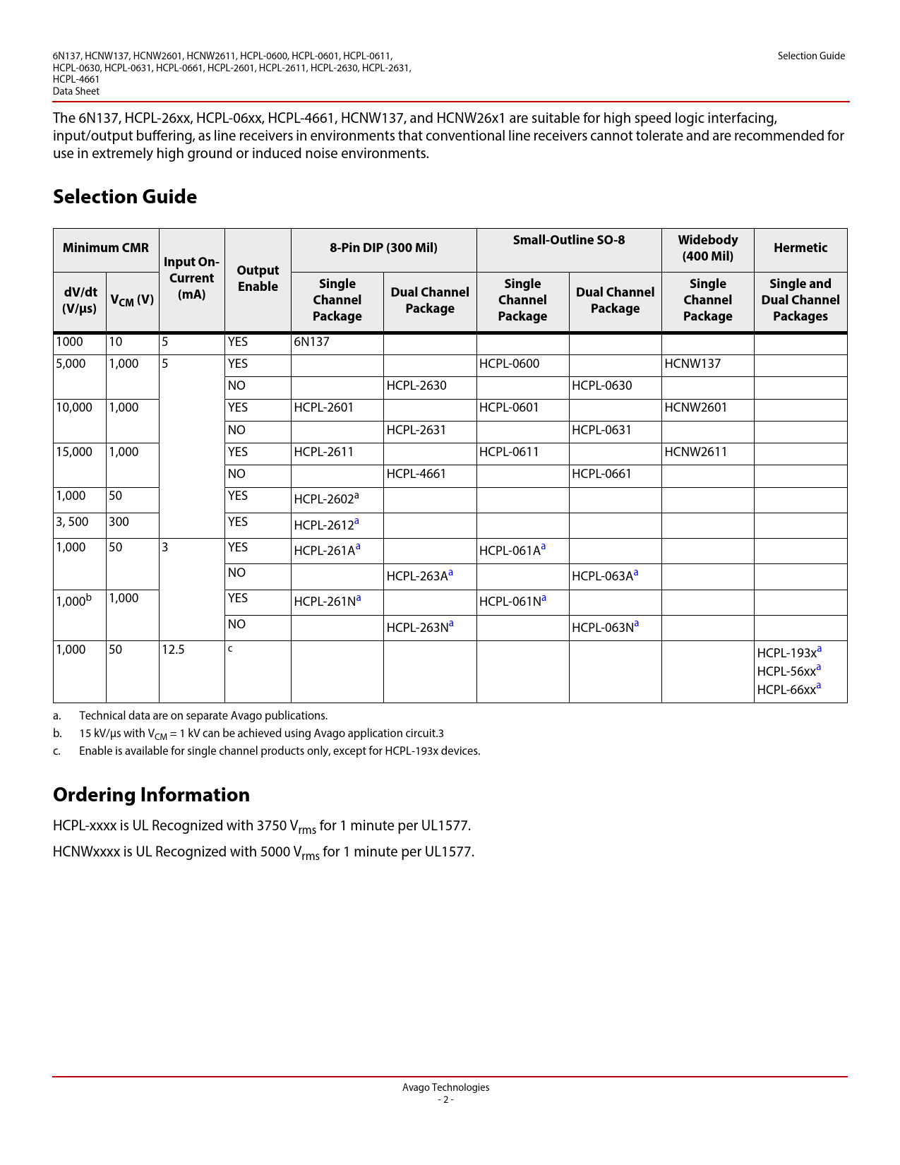 1000 10 5 YES 6N137 5,000 1,000 5 YES HCPL-0600 HCNW137 NO HCPL-2630 HCPL-0630 10,000 1,000 YES HCPL-2601 HCPL-0601 HCNW2601 NO HCPL-2631 HCPL-0631 15,000 1,000 YES HCPL-2611 HCPL-0611 HCNW2611 NO HCPL-4661 HCPL-0661 1,000 50 YES HCPL-2602a 3, 500 300 YES HCPL-2612a 1,000 50 3 YES HCPL-261Aa HCPL-061Aa NO HCPL-263Aa HCPL-063Aa 1,000b 1,000 YES HCPL-261Na HCPL-061Na NO HCPL-263Na HCPL-063Na 1,000 50 12.5 c HCPL-193xa HCPL-56xxa HCPL-66xxa a. Technical data are on separate Avago publications. b. 15 kV/μs with VCM = 1 kV can be achieved using Avago application circuit.3 c. Enable is available for single channel products only, except for HCPL-193x devices.