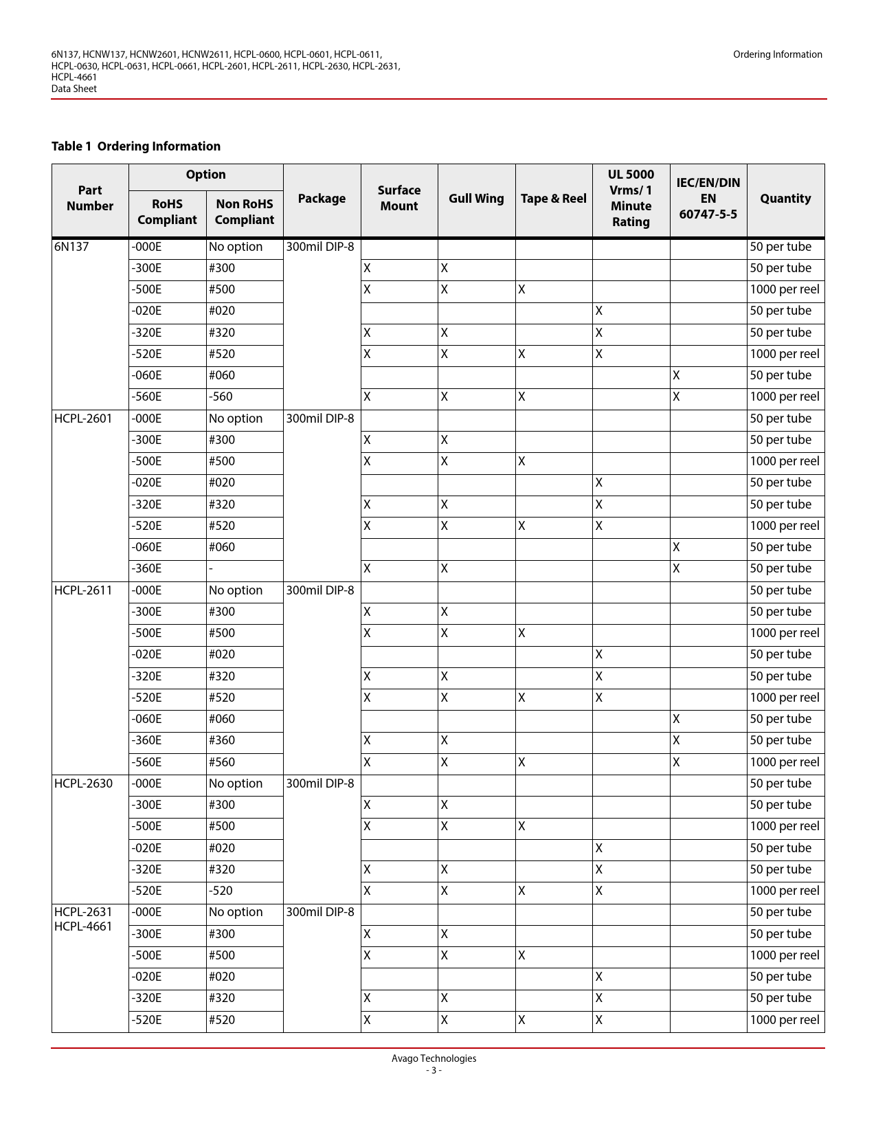 6N137, HCNW137, HCNW2601, HCNW2611, HCPL-0600, HCPL-0601, HCPL-0611, Ordering Information HCPL-0630, HCPL-0631, HCPL-0661, HCPL-2601, HCPL-2611, HCPL-2630, HCPL-2631, HCPL-4661 Data Sheet