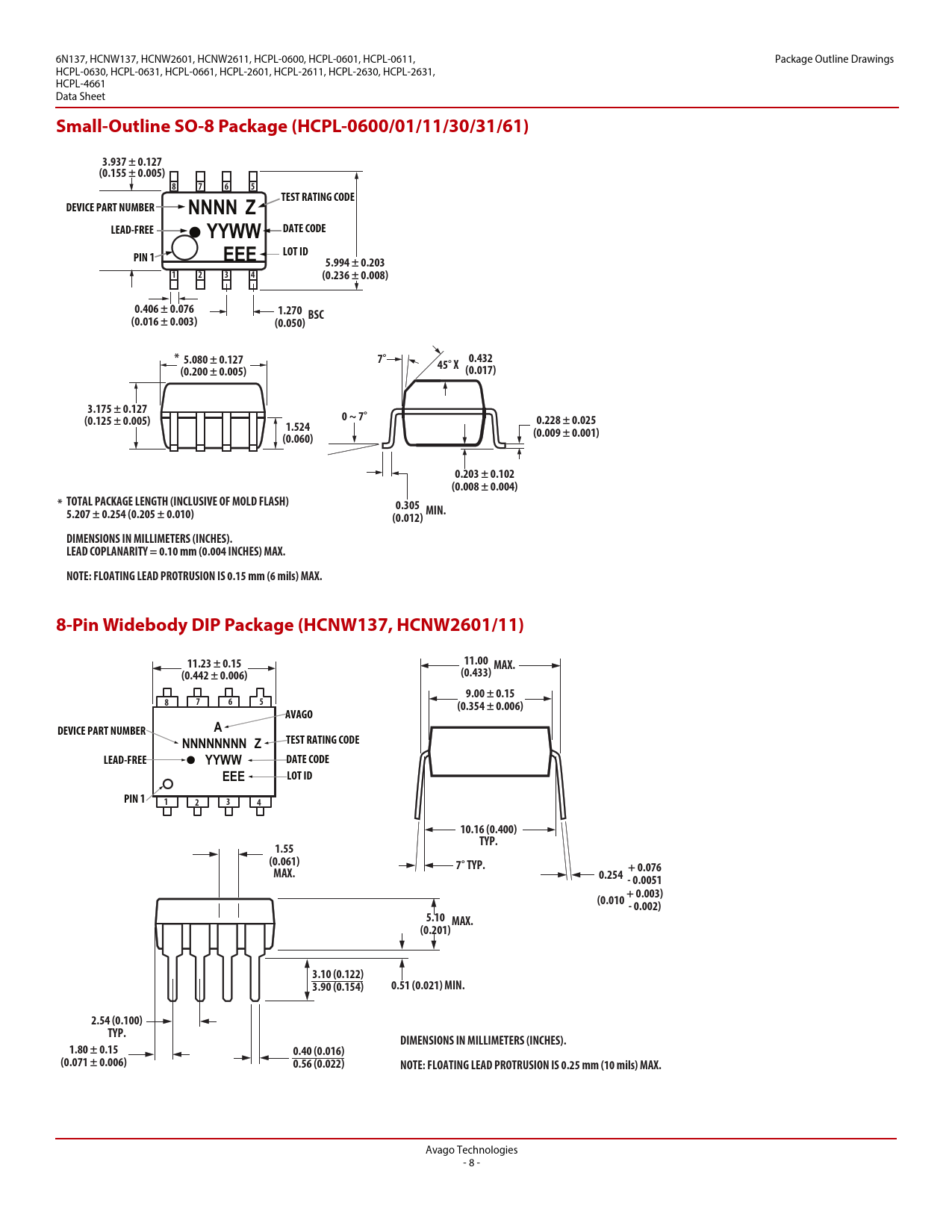 Small-Outline SO-8 Package (HCPL-0600/01/11/30/31/61) 3.937 ± 0.127 (0.155 ± 0.005) 8 7 6 5 NNNN Z TEST RATING CODE DEVICE PART NUMBER LEAD-FREE YYWW • DATE CODE PIN 1 EEE LOT ID 5.994 ± 0.203 1 2 3 4 (0.236 ± 0.008) 0.406 ± 0.076 1.270 BSC (0.016 ± 0.003) (0.050) * 5.080 ± 0.127 7° 0.432 45° X (0.200 ± 0.005) (0.017) 3.175 ± 0.127 (0.125 ± 0.005) 0 ~ 7° 0.228 ± 0.025 1.524 (0.009 ± 0.001) (0.060) 0.203 ± 0.102 (0.008 ± 0.004) * TOTAL PACKAGE LENGTH (INCLUSIVE OF MOLD FLASH) 0.305 MIN. 5.207 ± 0.254 (0.205 ± 0.010) (0.012) DIMENSIONS IN MILLIMETERS (INCHES). LEAD COPLANARITY = 0.10 mm (0.004 INCHES) MAX. NOTE: FLOATING LEAD PROTRUSION IS 0.15 mm (6 mils) MAX. 8-Pin Widebody DIP Package (HCNW137, HCNW2601/11) 11.23 ± 0.15 11.00 MAX. (0.442 ± 0.006) (0.433) 9.00 ± 0.15 8 7 6 5 (0.354 ± 0.006) AVAGO DEVICE PART NUMBER A NNNNNNNN Z TEST RATING CODE LEAD-FREE YYWW • DATE CODE EEE LOT ID PIN 1 1 2 3 4 10.16 (0.400) TYP. 1.55 (0.061) 7° TYP. + 0.076 MAX. 0.254 - 0.0051 + 0.003) (0.010 - 0.002) 5.10 MAX. (0.201) 3.10 (0.122) 3.90 (0.154) 0.51 (0.021) MIN. 2.54 (0.100) TYP. DIMENSIONS IN MILLIMETERS (INCHES). 1.80 ± 0.15 0.40 (0.016) (0.071 ± 0.006) 0.56 (0.022) NOTE: FLOATING LEAD PROTRUSION IS 0.25 mm (10 mils) MAX.
